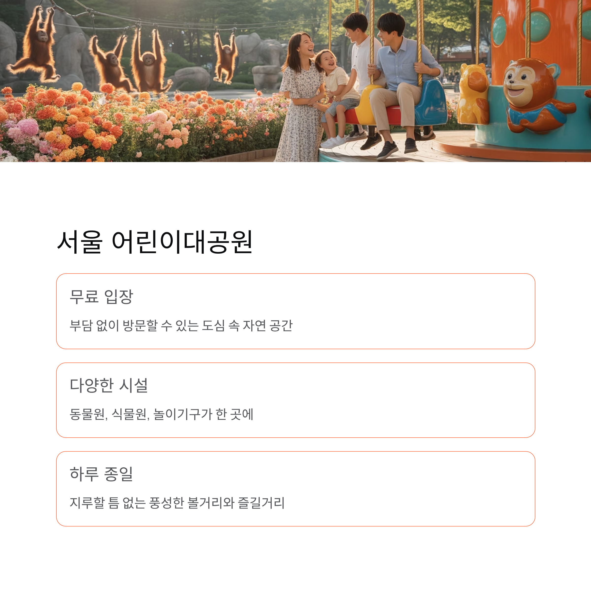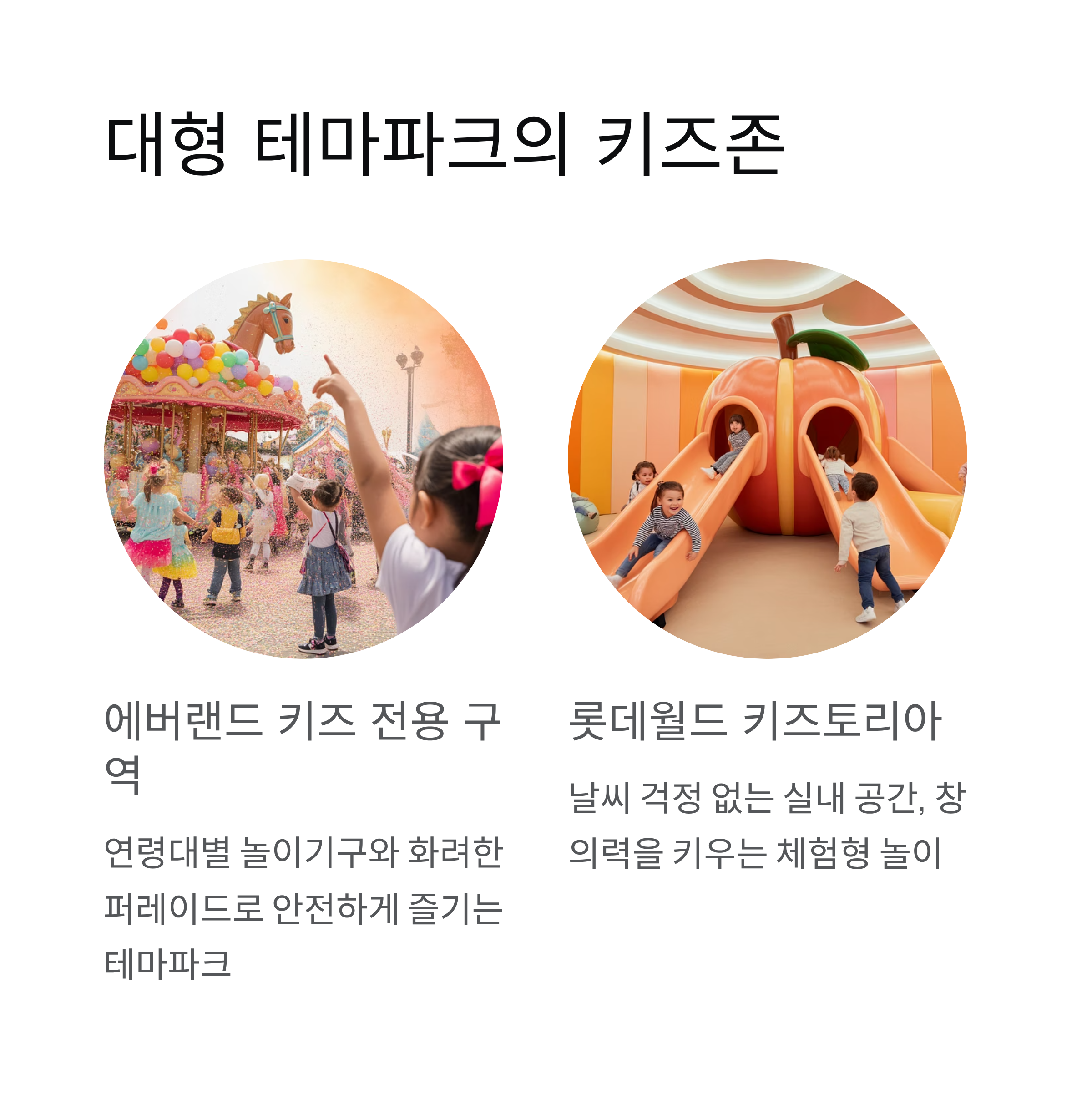 아이들은 신나는 놀이기구와 체험 활동으로 즐겁고, 부모님은 안전하면서도 편의시설이 잘 갖춰진 곳을 찾게 됩니다.