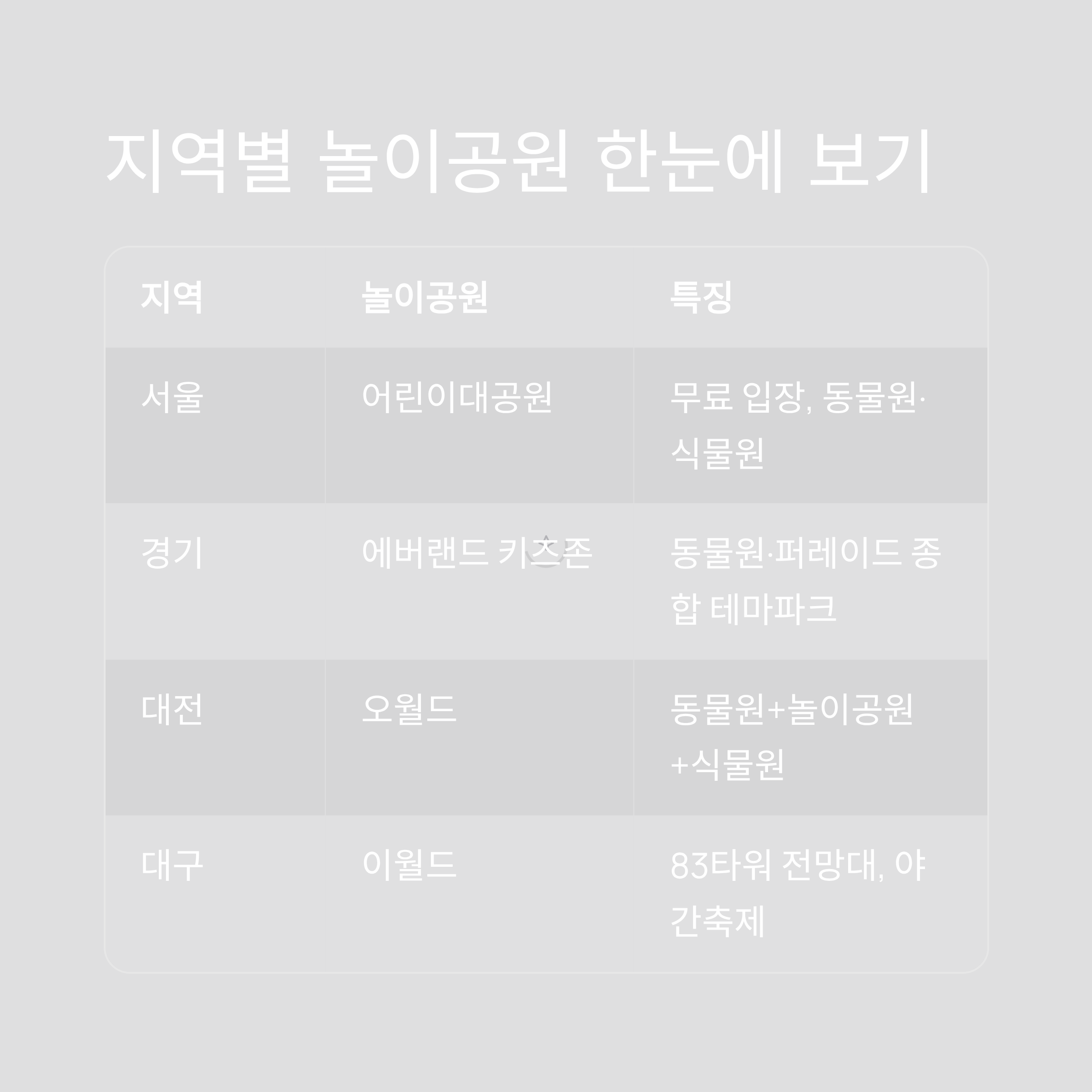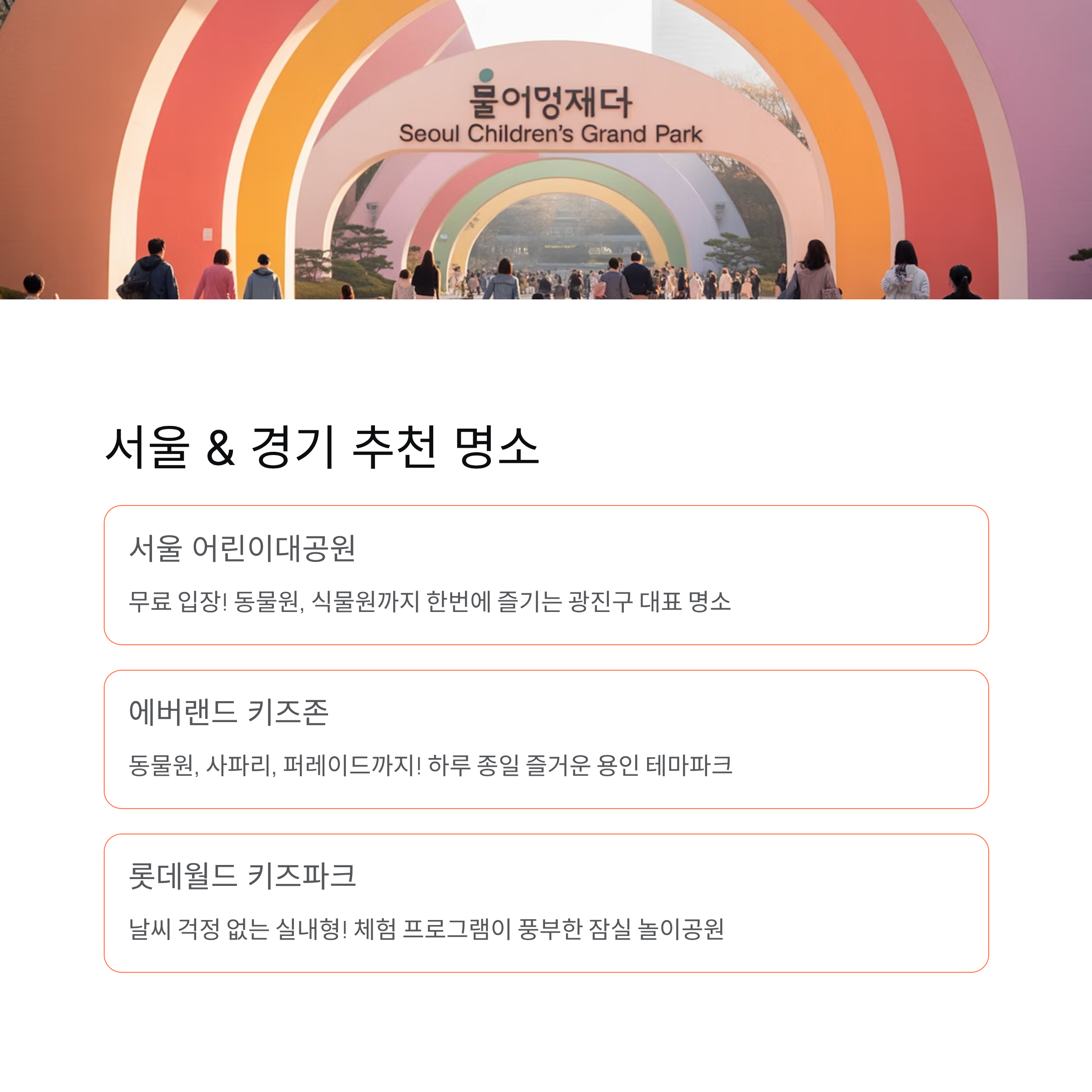 | 경기 | 에버랜드 키즈존 | 동물원·퍼레이드 포함 종합 테마파크 |