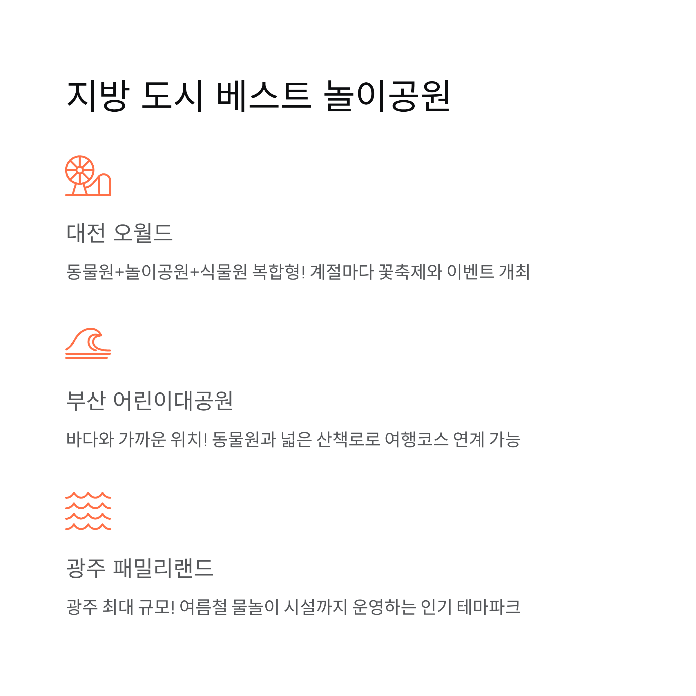 오늘은 전국에서 가족과 함께 즐기기 좋은 어린이 놀이공원을 소개합니다.