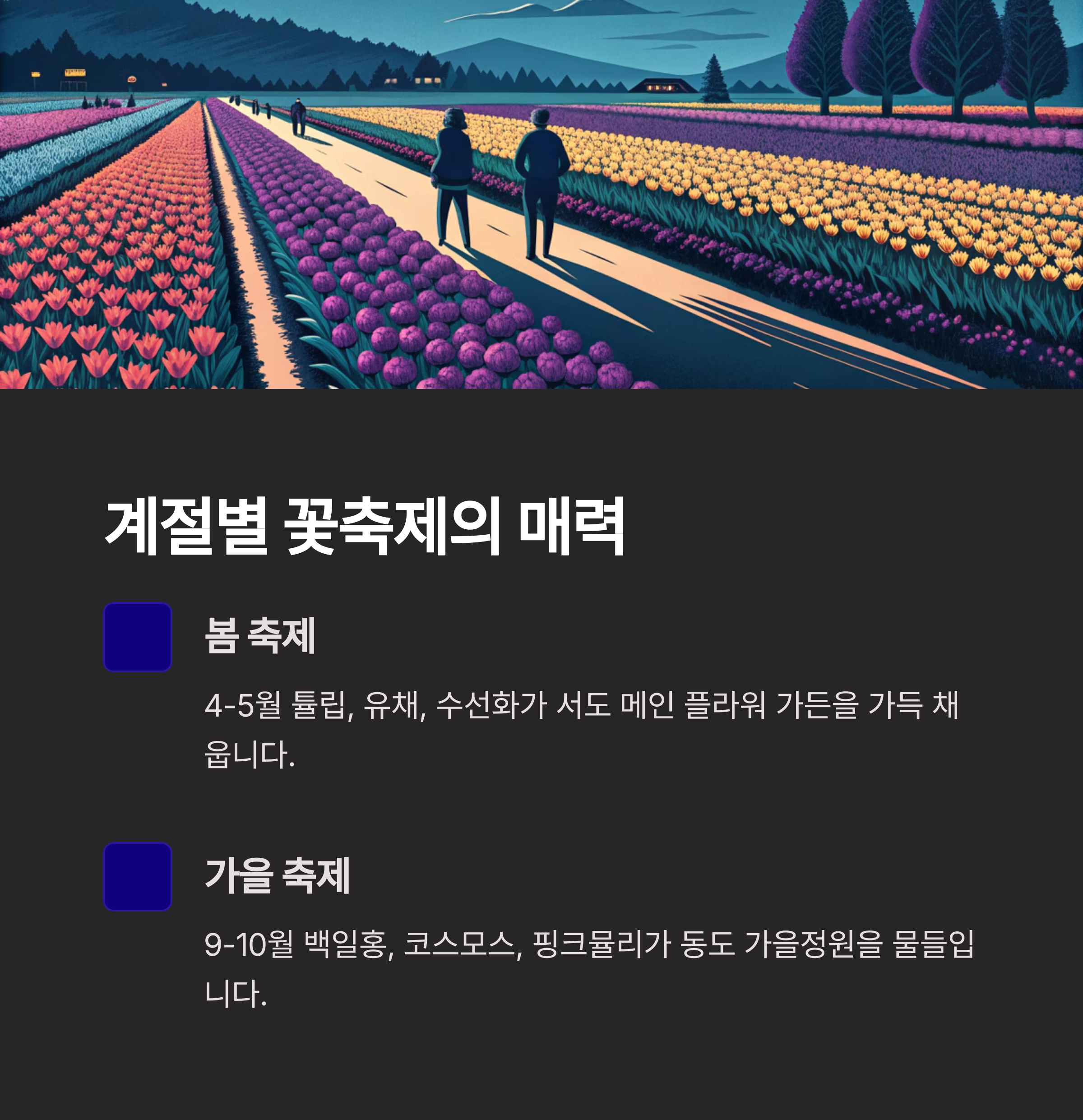 | 봄 | 튤립, 유채, 수선화 | 서도 메인 플라워 가든, 자라섬 북단 주변 |