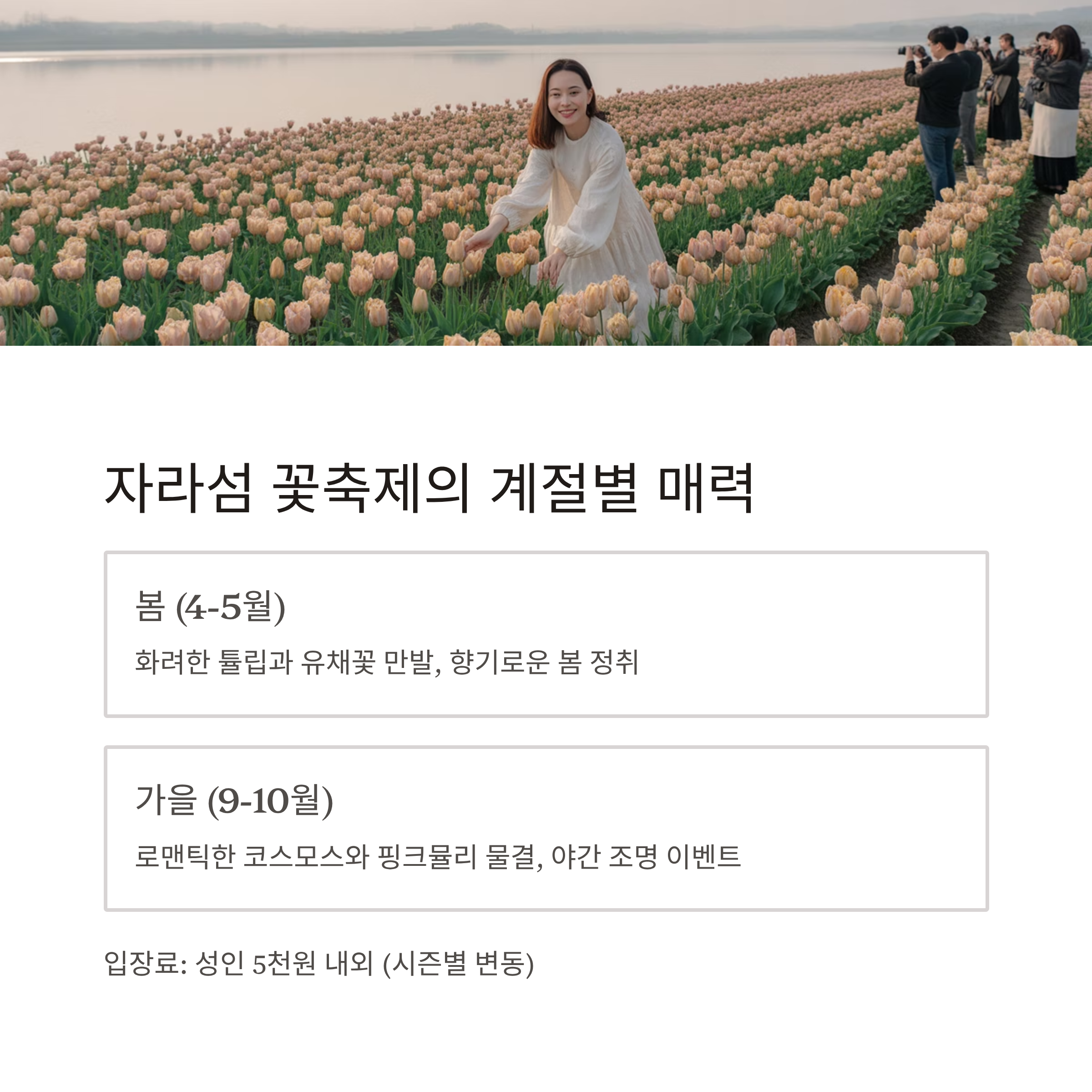 이번 글에서는 자라섬 꽃축제 일정과 캠핑 준비 팁, 주변 관광지 정보까지