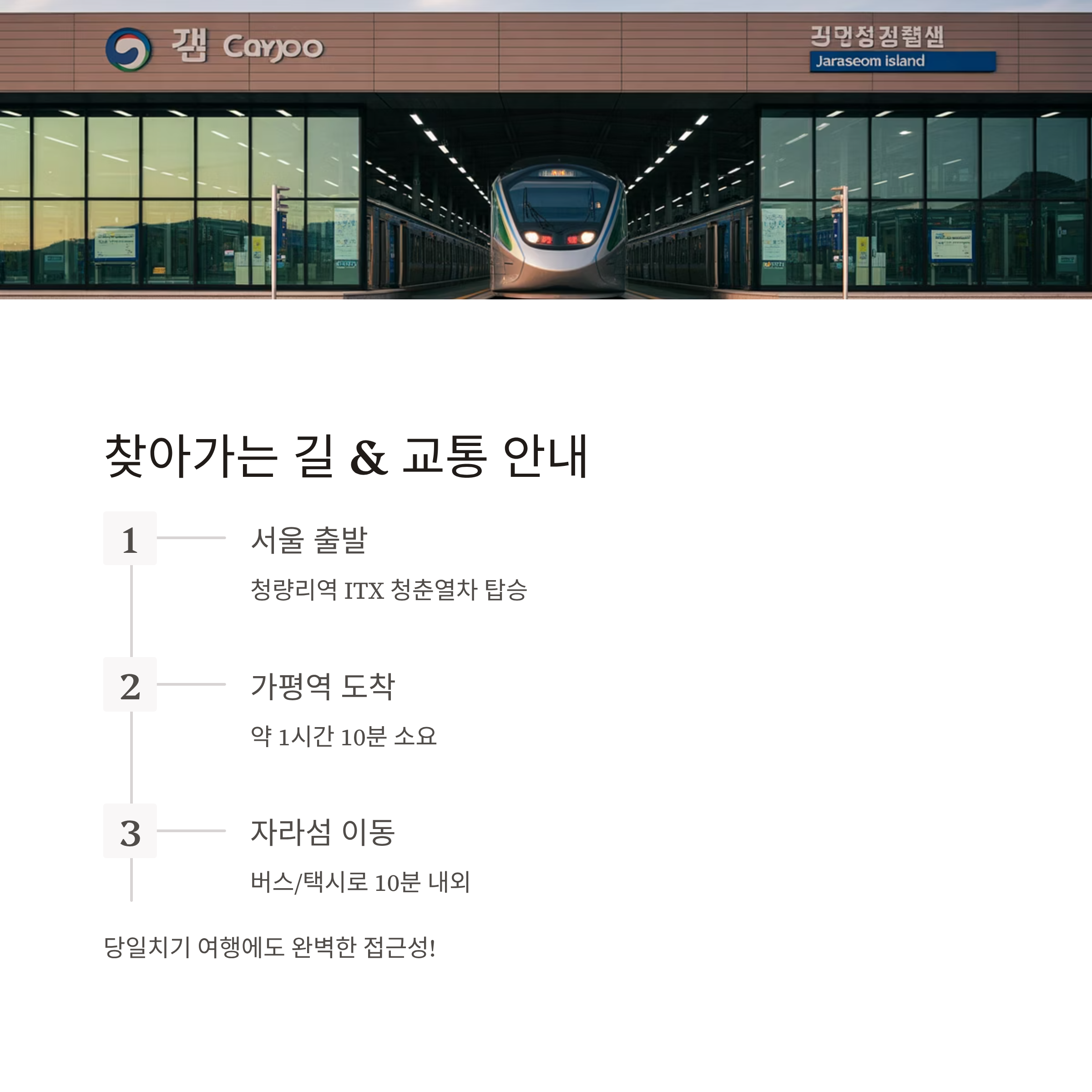 역에서 버스나 택시를 이용하면 자라섬까지 10분 내외로 도착할 수 있어 당일치기 여행에도 적합합니다.
