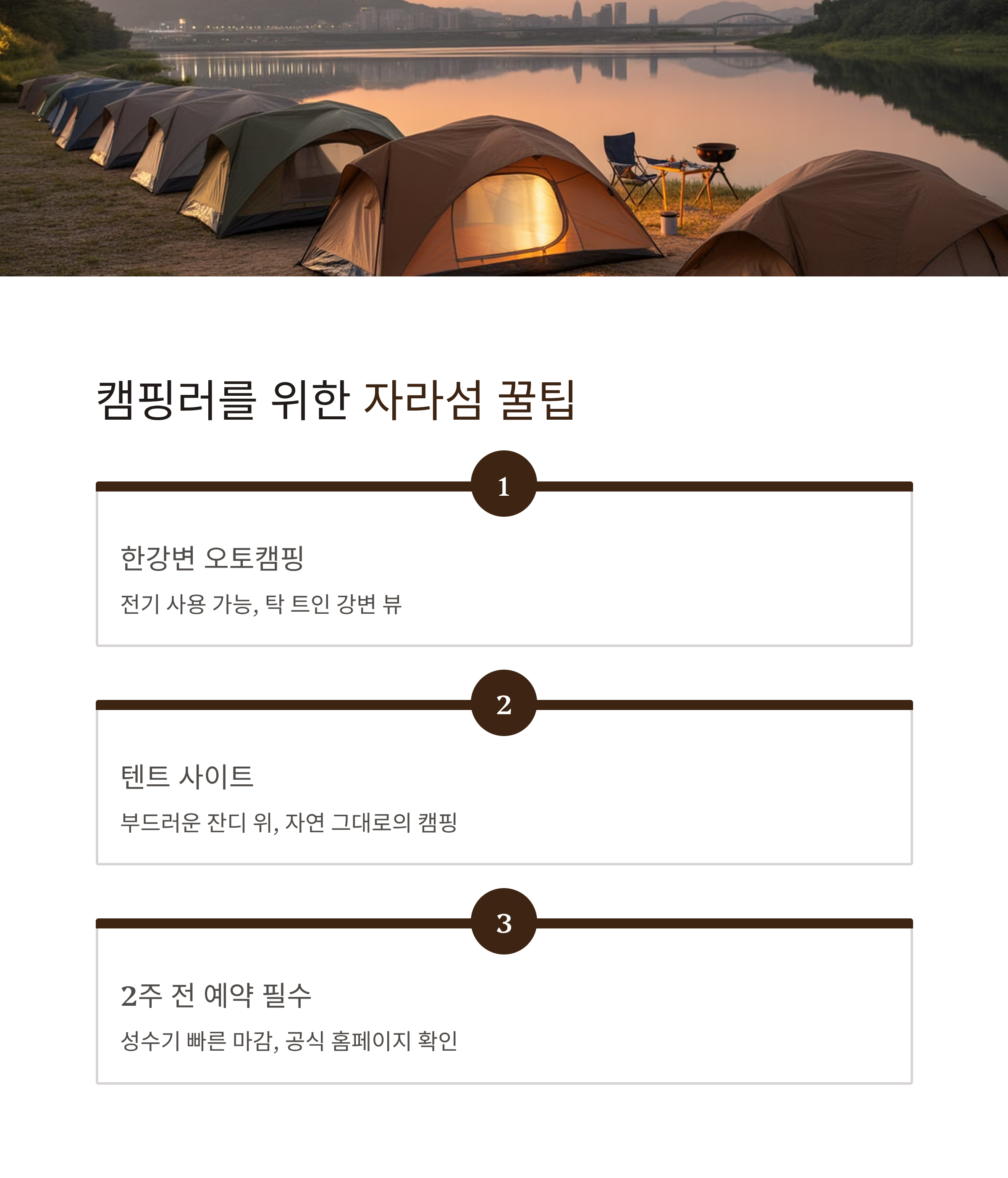 자라섬 캠핑장은 한강변에 인접해 탁 트인 뷰를 제공합니다.