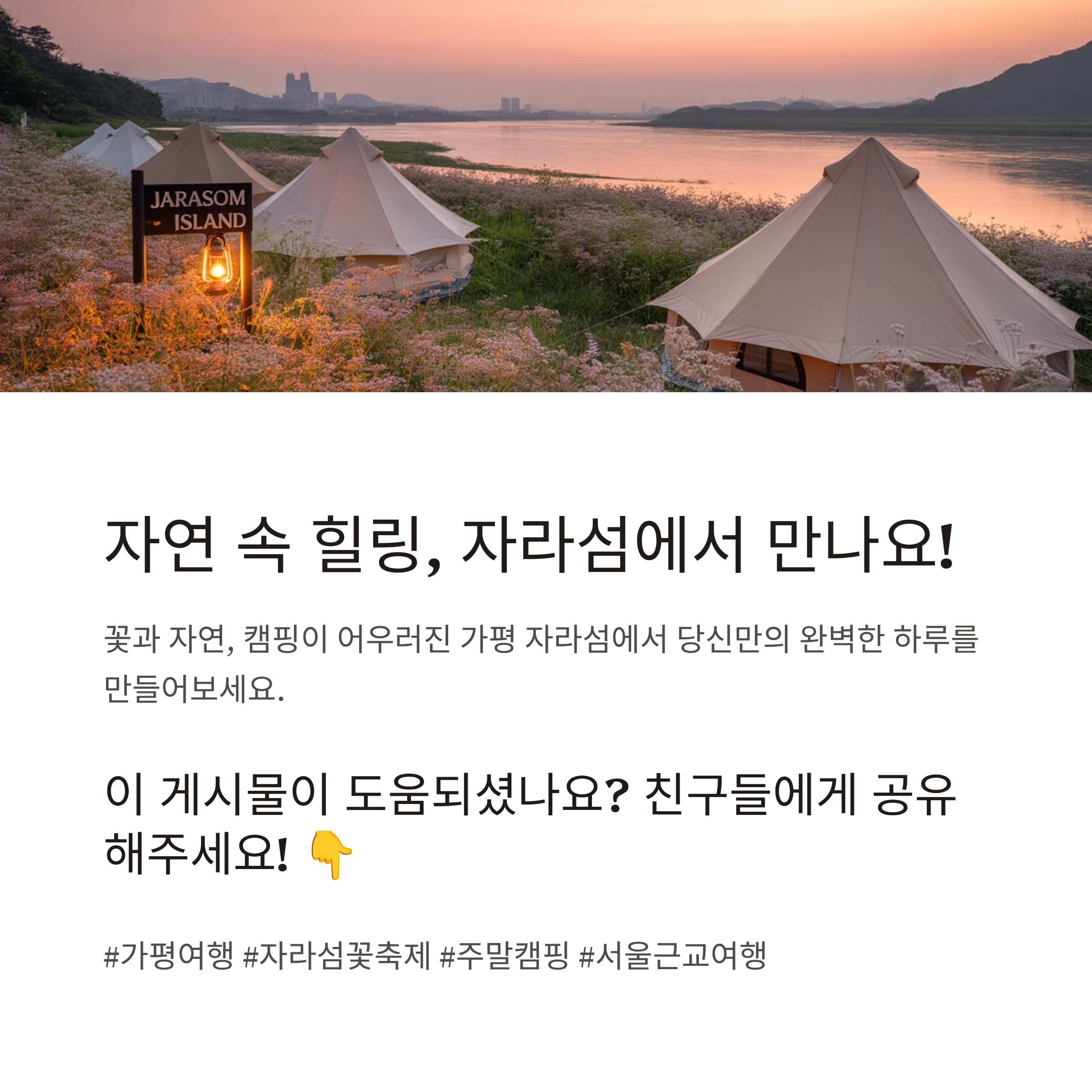 이번 글에서는 자라섬 꽃축제 일정과 캠핑 준비 팁, 주변 관광지 정보까지