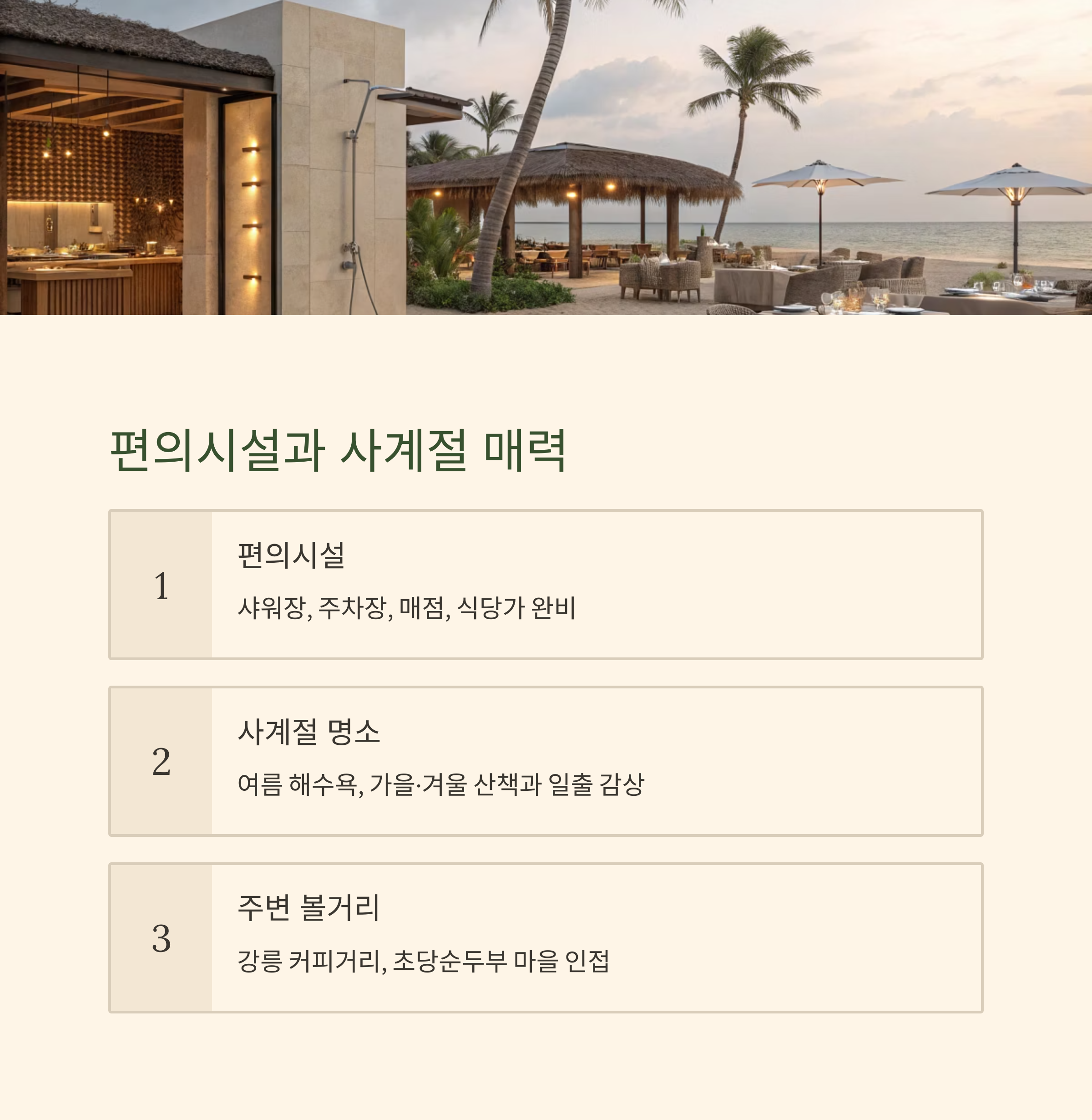 | 주차장 | 해변 도로변 및 전용 주차장 | 24시간 |