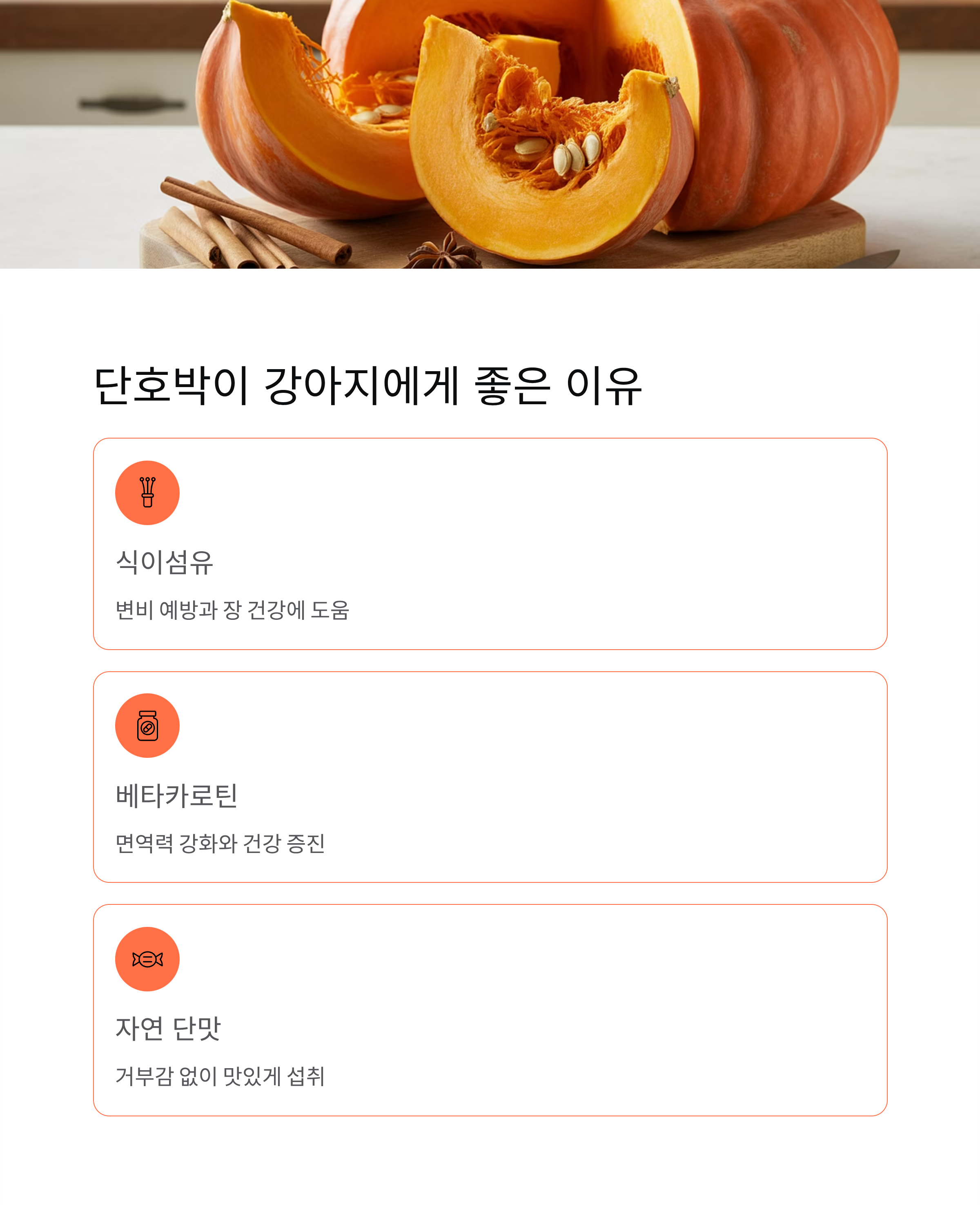 단호박은 식이섬유가 풍부해 변비 예방에 도움을 주고, 베타카로틴과 비타민이 들어 있어 면역력 강화에도 좋습니다. 또한 자연스러운 단맛 덕분에 강아지가 거부감 없이 잘 먹습니다.
