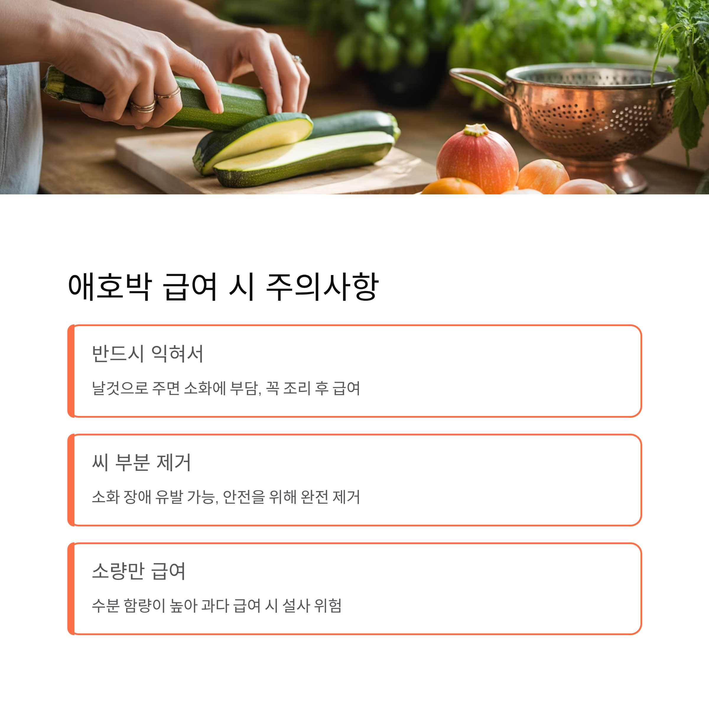 애호박은 수분이 많아 소량 급여 시 큰 문제는 없지만, 날 것으로 주면 소화에 부담을 줄 수 있습니다. 반드시 익혀서 주는 것이 원칙이며, 씨 부분은 소화 장애를 일으킬 수 있어 제거하는 게 안전합니다.