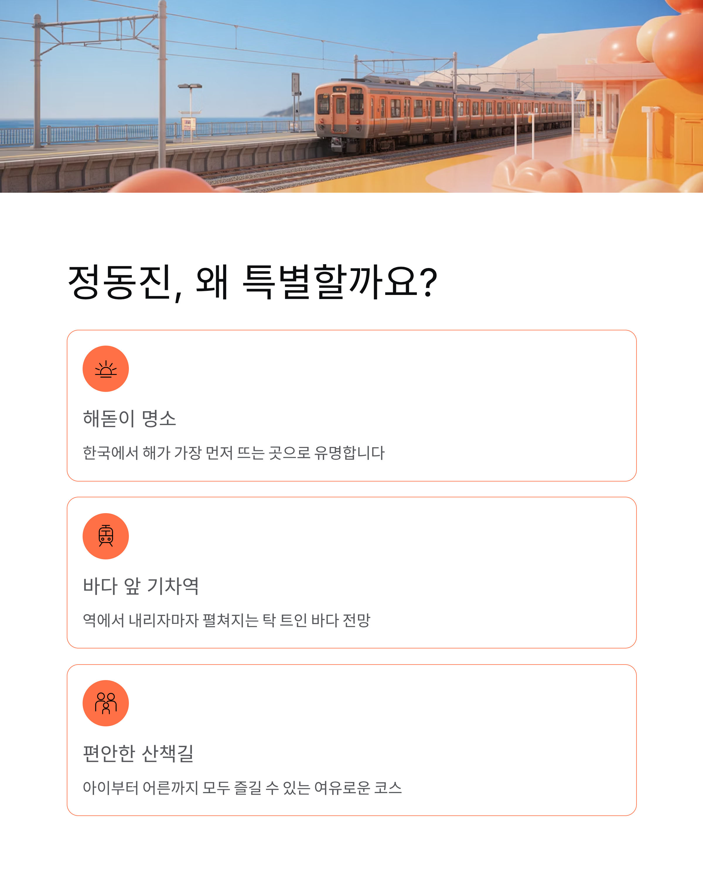 | 정동진역 | 바다와 가장 가까운 기차역으로 시작 코스 적합 |