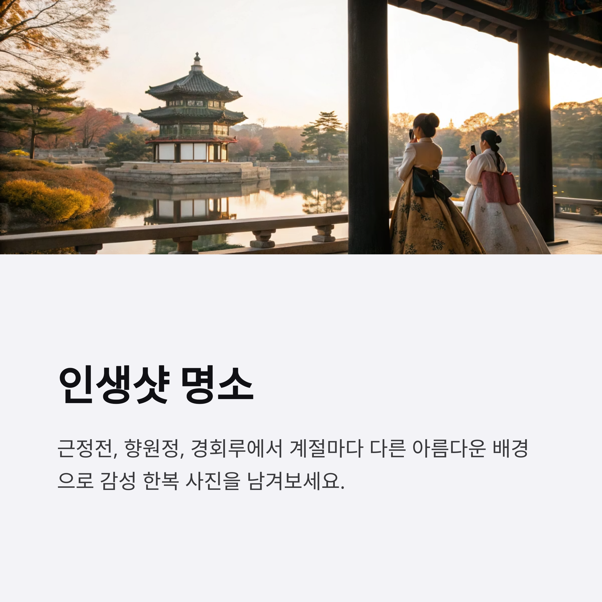 한복 차림으로 촬영하면 감성적인 전통 사진을 남기기에 딱 좋습니다.