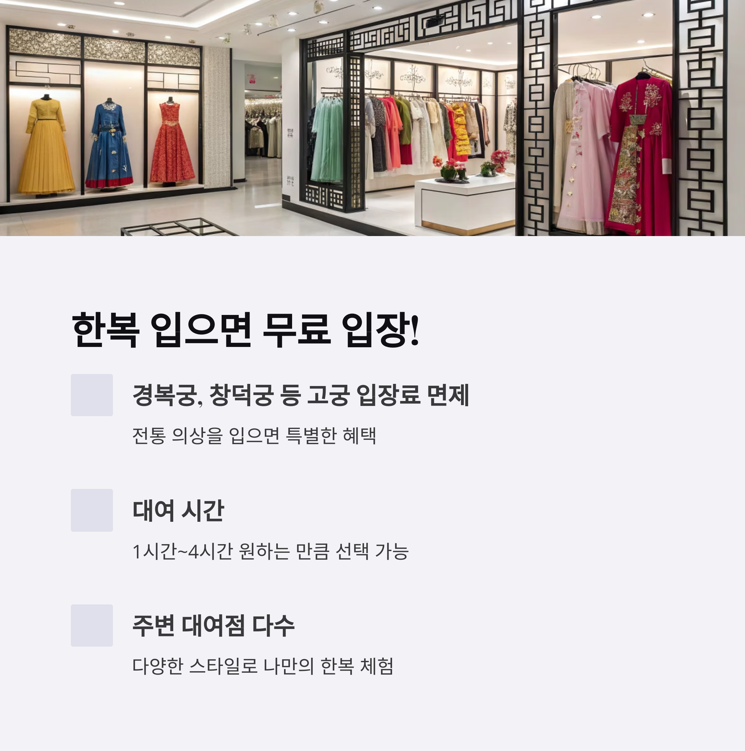 | 한복 착용 시 입장료 | 무료 (경복궁, 창덕궁 등) |