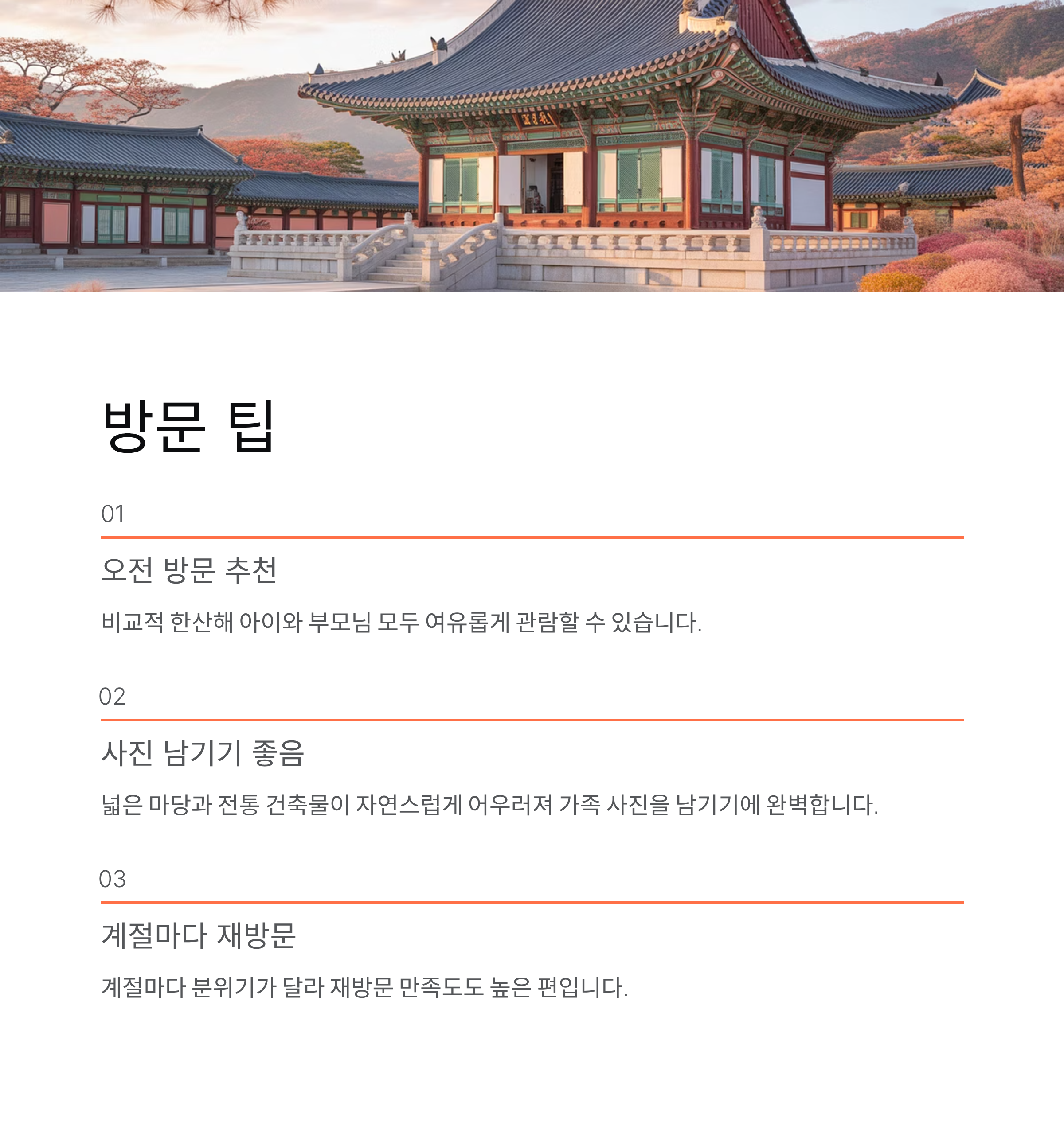 가족 여행이라면 오전 방문을 추천드립니다. 비교적 한산해 아이와 부모님 모두 여유롭게 관람할 수 있습니다. 오후에는 단체 관광객이 늘어날 수 있어 조용한 분위기를 원한다면 이른 시간대가 좋습니다.