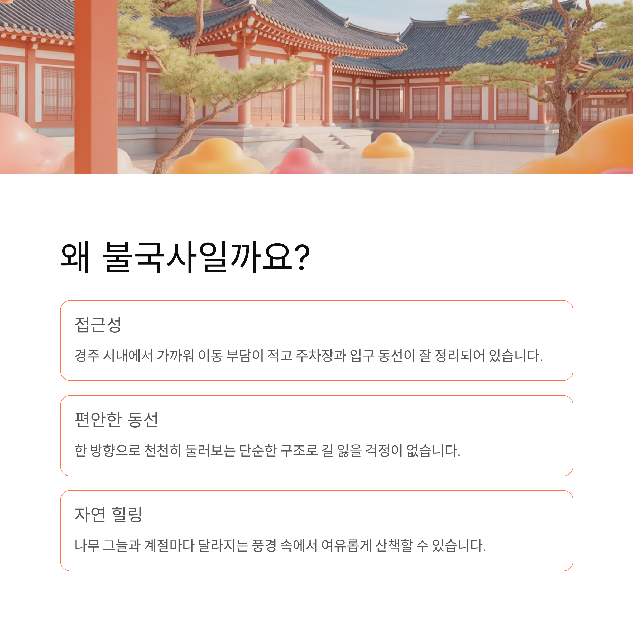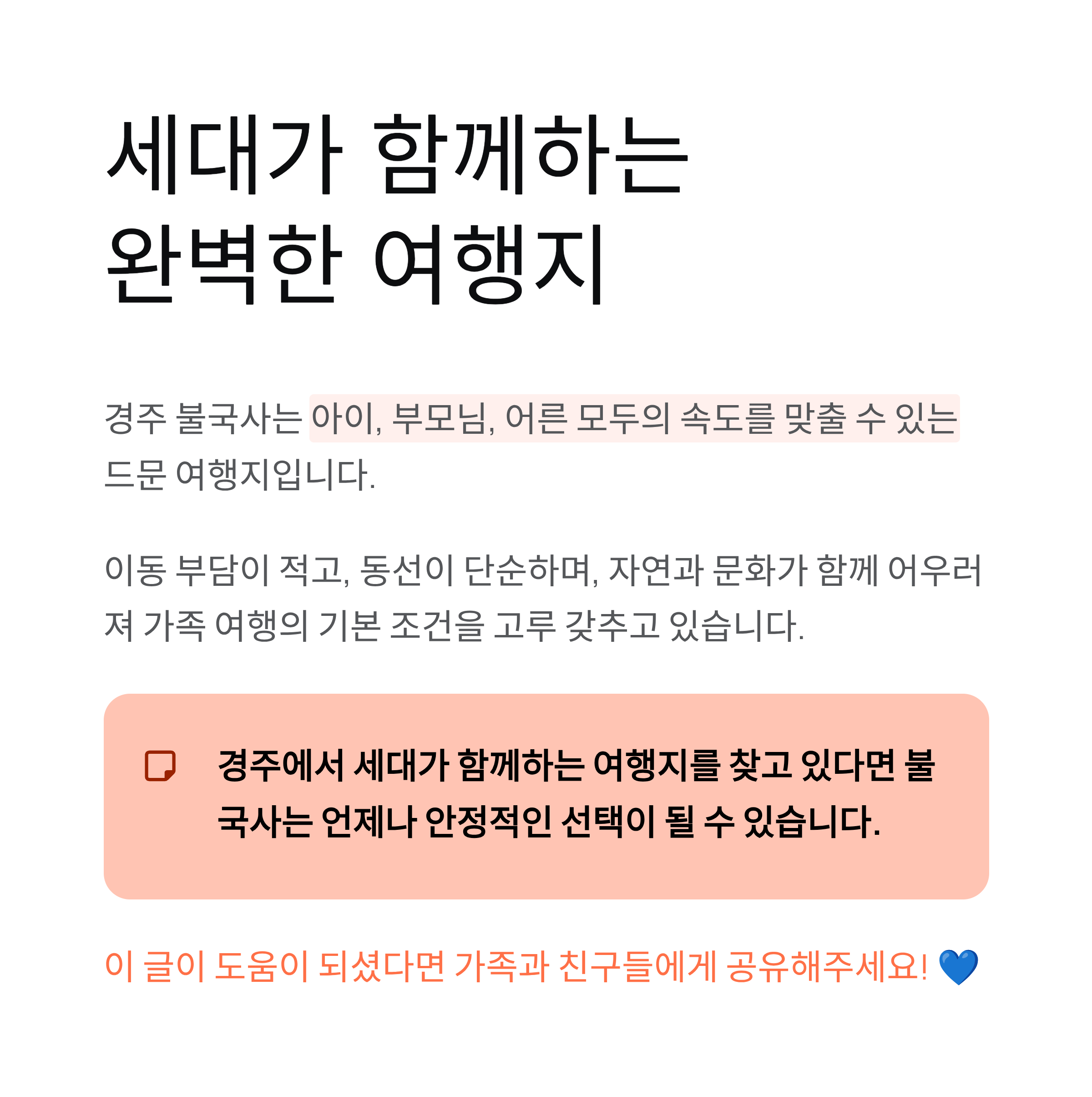 경주 불국사는 아이, 부모님, 어른 모두의 속도를 맞출 수 있는 드문 여행지입니다. 이동 부담이 적고, 동선이 단순하며, 자연과 문화가 함께 어우러져 가족 여행의 기본 조건을 고루 갖추고 있습니다. 경주에서 세대가 함께하는 여행지를 찾고 있다면 불국사는 언제나 안정적인 선택이 될 수 있습니다.