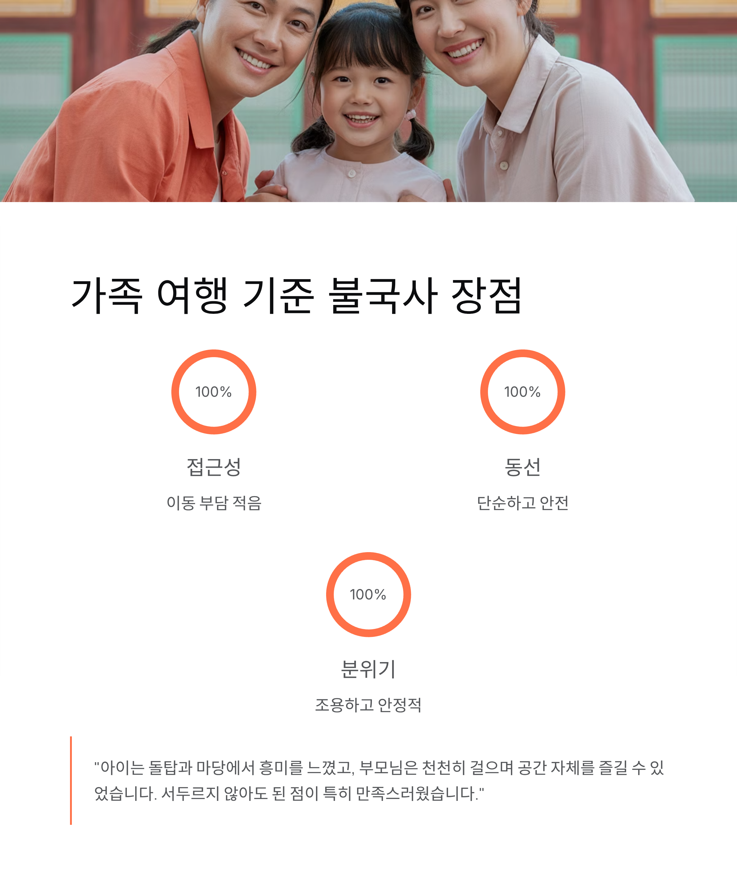 아이와 부모님을 모시고 불국사를 방문했던 한 가족은 모두가 편안함을 느꼈다고 이야기합니다. 아이는 돌탑과 마당에서 흥미를 느꼈고, 부모님은 천천히 걸으며 공간 자체를 즐길 수 있었다고 합니다. 일정 중간에 쉬어 갈 수 있는 장소가 많아 서두르지 않아도 된 점이 특히 만족스러웠다고 합니다.