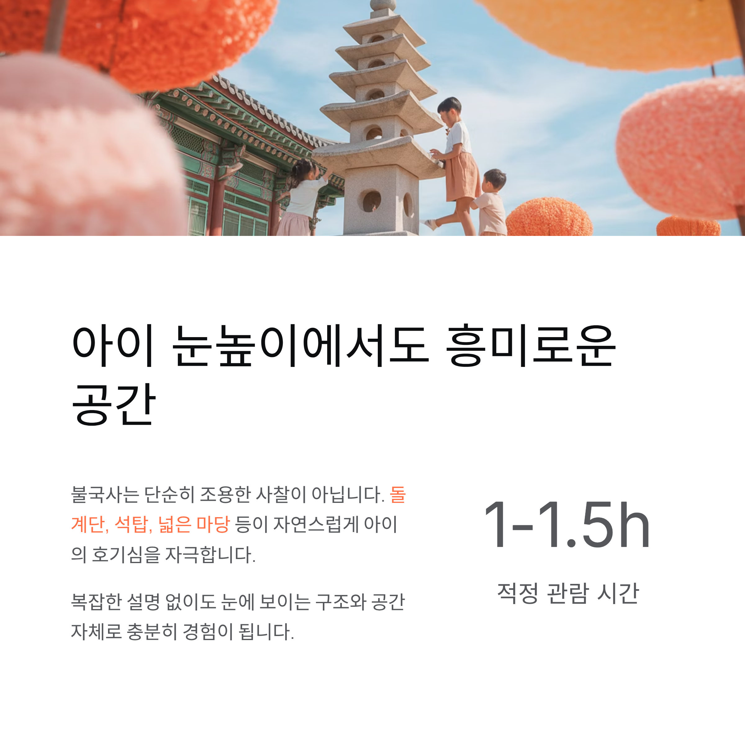 불국사는 단순히 조용한 사찰이 아니라 아이들이 눈으로 보고 느낄 수 있는 요소가 많습니다. 돌계단, 석탑, 넓은 마당 등은 자연스럽게 아이의 호기심을 자극합니다. 복잡한 설명 없이도 눈에 보이는 구조와 공간 자체로 충분히 경험이 됩니다.