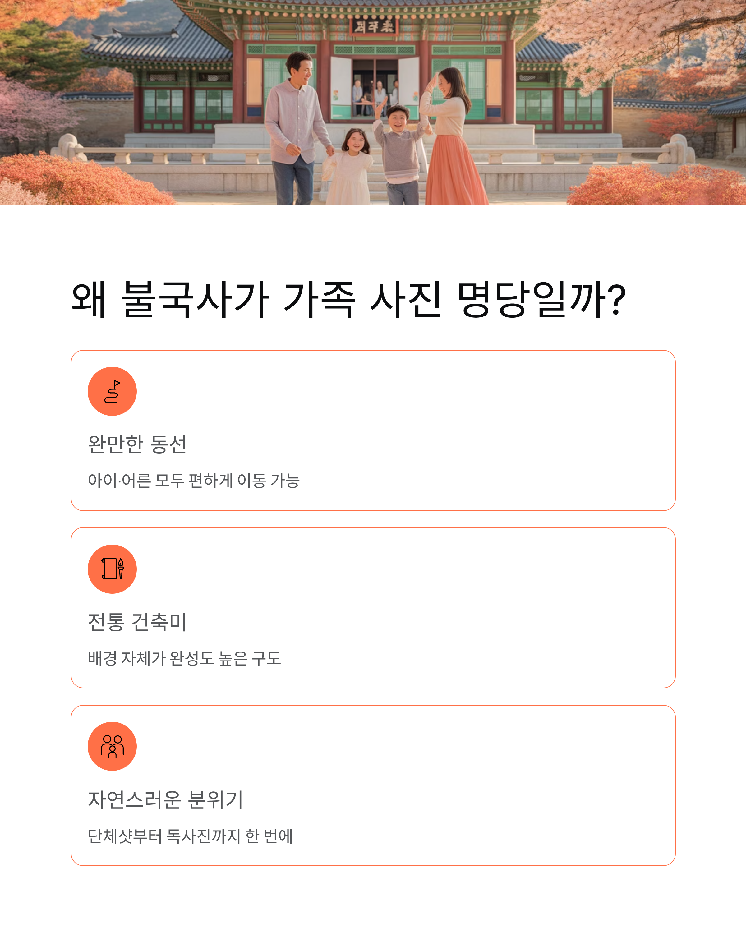 불국사는 가족 사진 명소로 몇 가지 확실한 장점이 있어요.