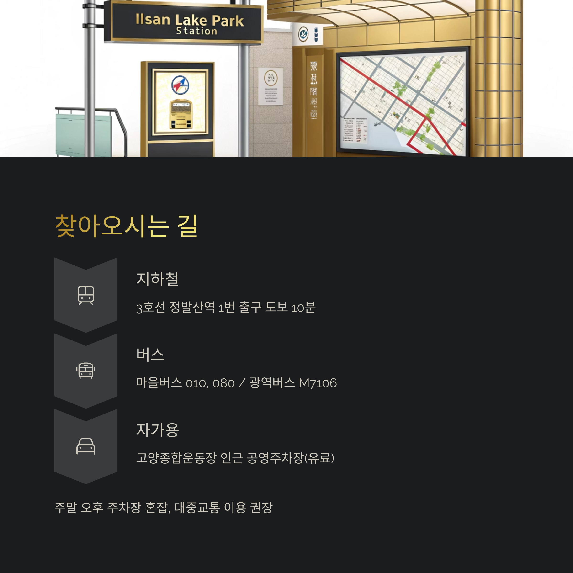 | 지하철 | 3호선 정발산역 1번 출구 도보 10분 |