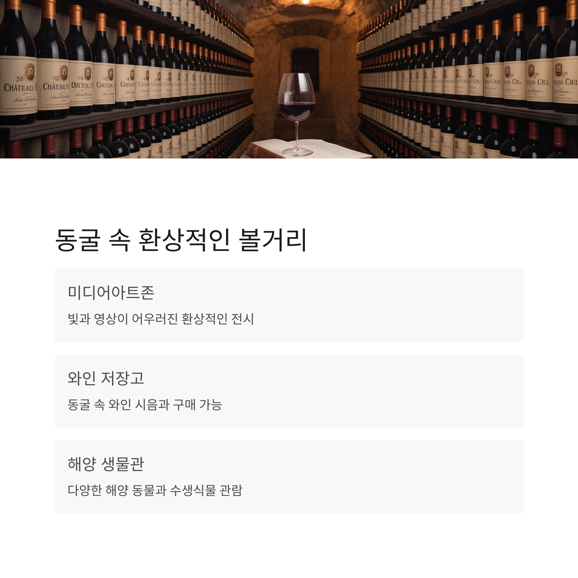 현재는 동굴 속에 미디어 아트, 와인 저장고, 해양 생물 전시 등