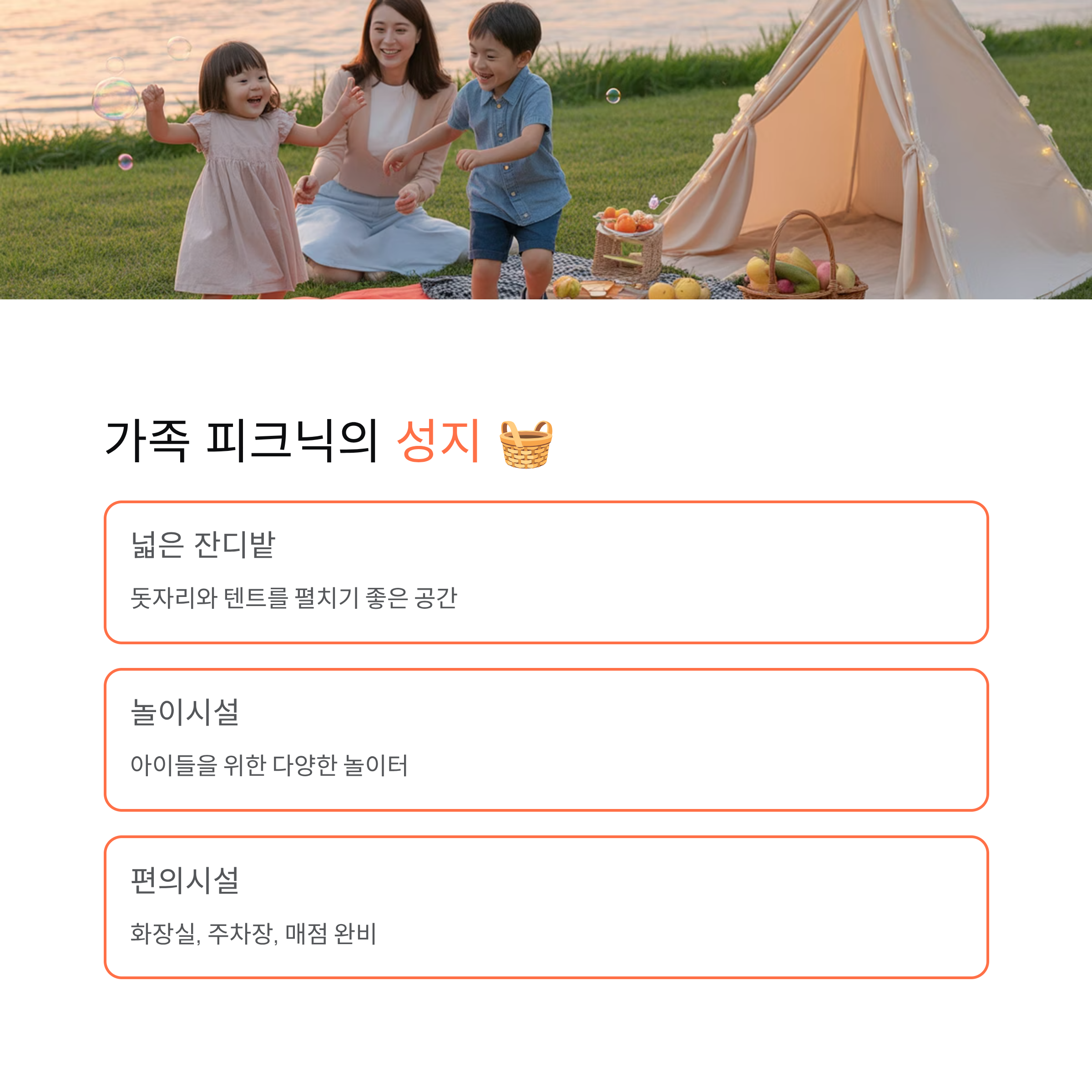 | 피크닉장 | 잔디밭, 나무 그늘, 놀이 시설 |