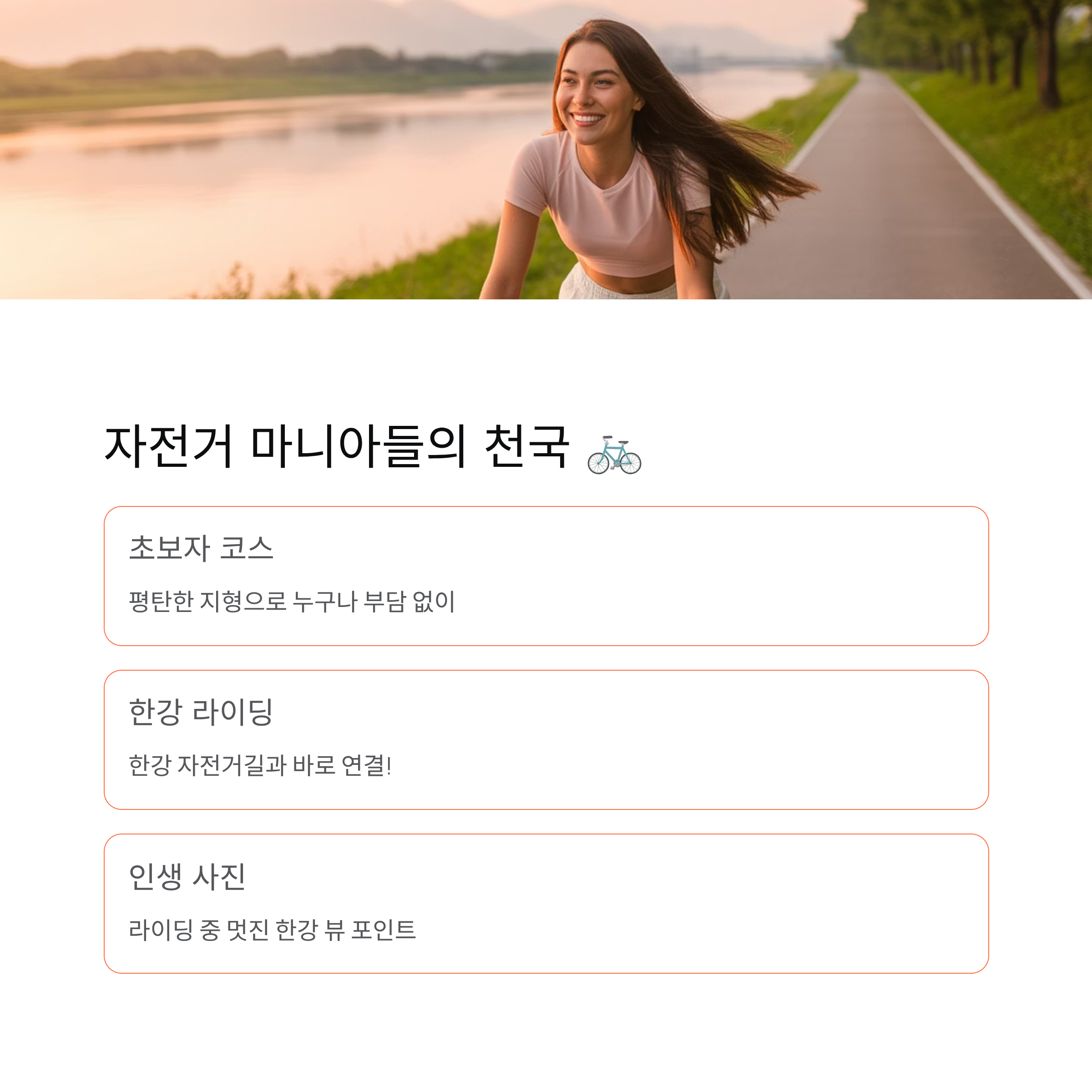 초보자부터 라이딩 마니아까지 모두 즐길 수 있으며, 주변 풍경이 아름다워 라이딩 도중 사진 명소로도 사랑받고 있습니다.