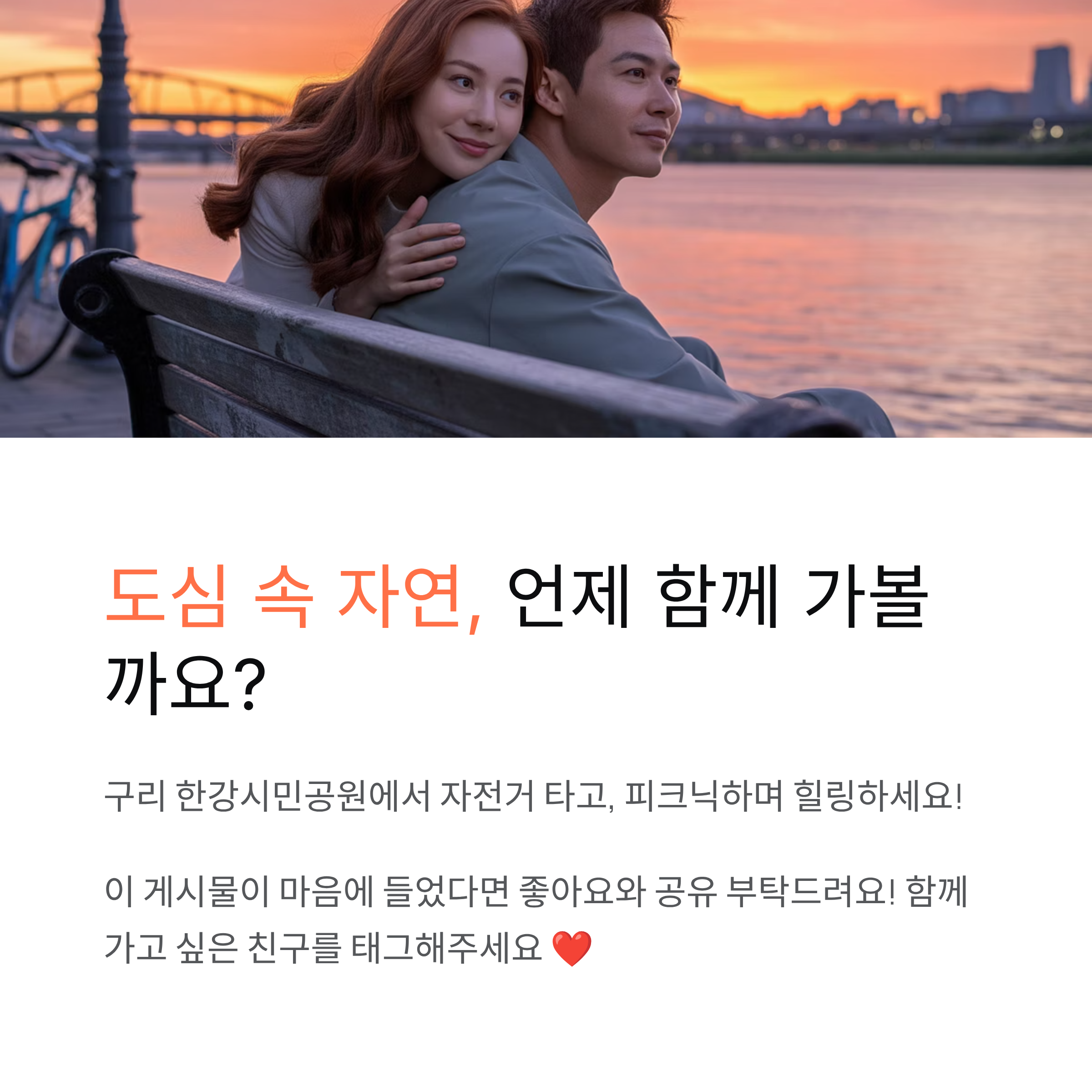 구리 한강시민공원은 자전거 라이딩과 피크닉을 동시에 즐길 수 있는 도심 속 힐링 공간입니다. 사계절 내내 가족, 연인, 친구와 함께 특별한 시간을 보내기 좋은 명소로, 주말 나들이에 적극 추천할 만합니다.