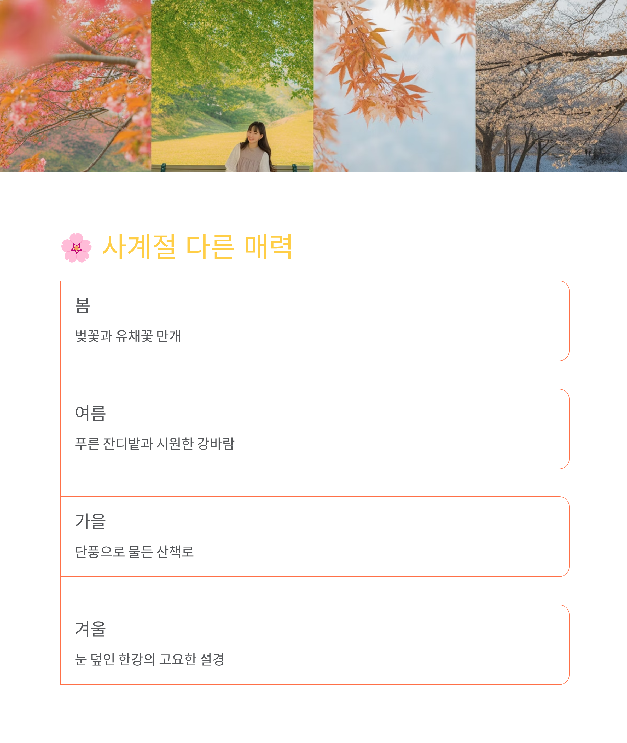 봄에는 벚꽃과 유채꽃, 여름에는 푸른 잔디와 시원한 강바람, 가을에는 단풍, 겨울에는 설경이 어우러져 사계절 내내 다른 매력을 보여줍니다.