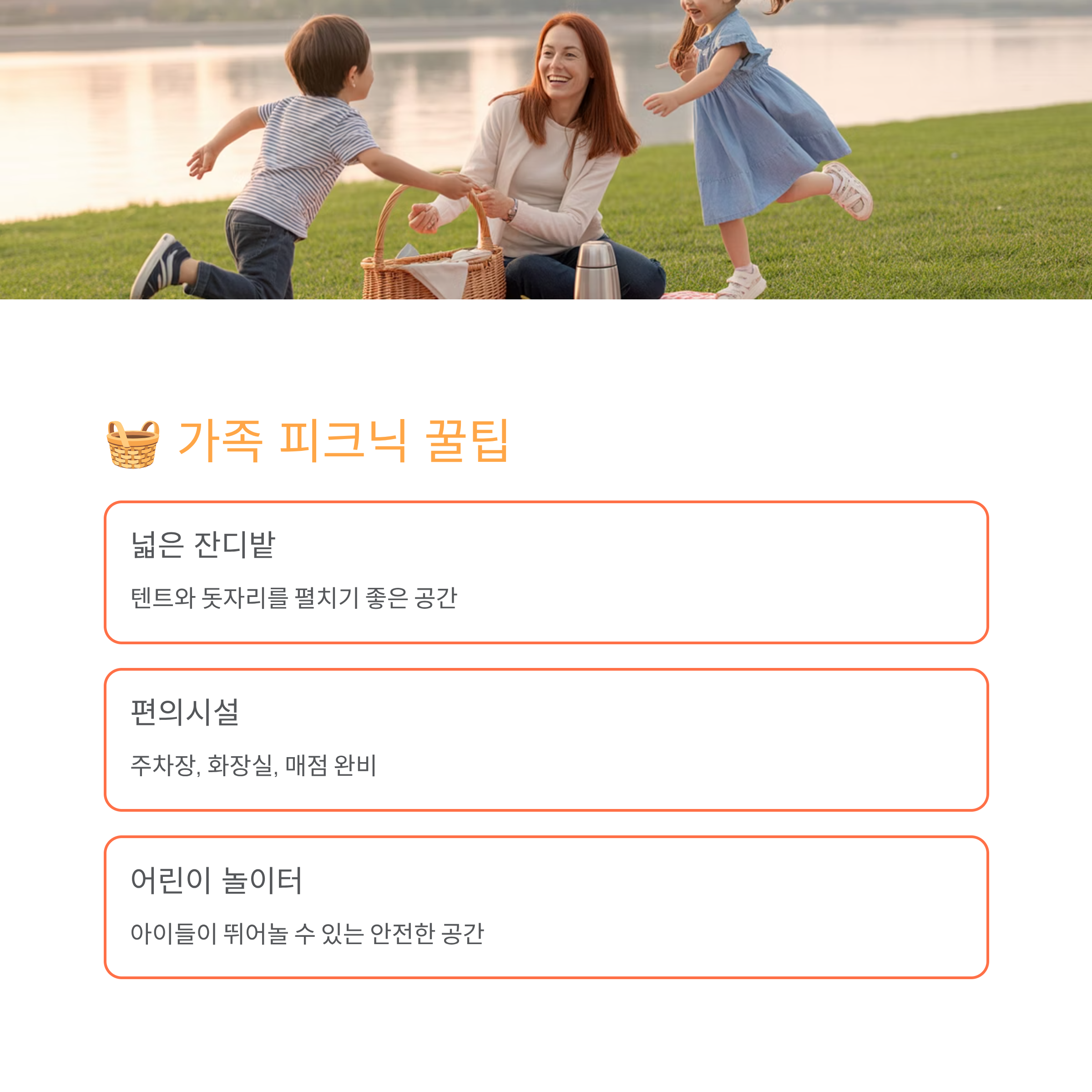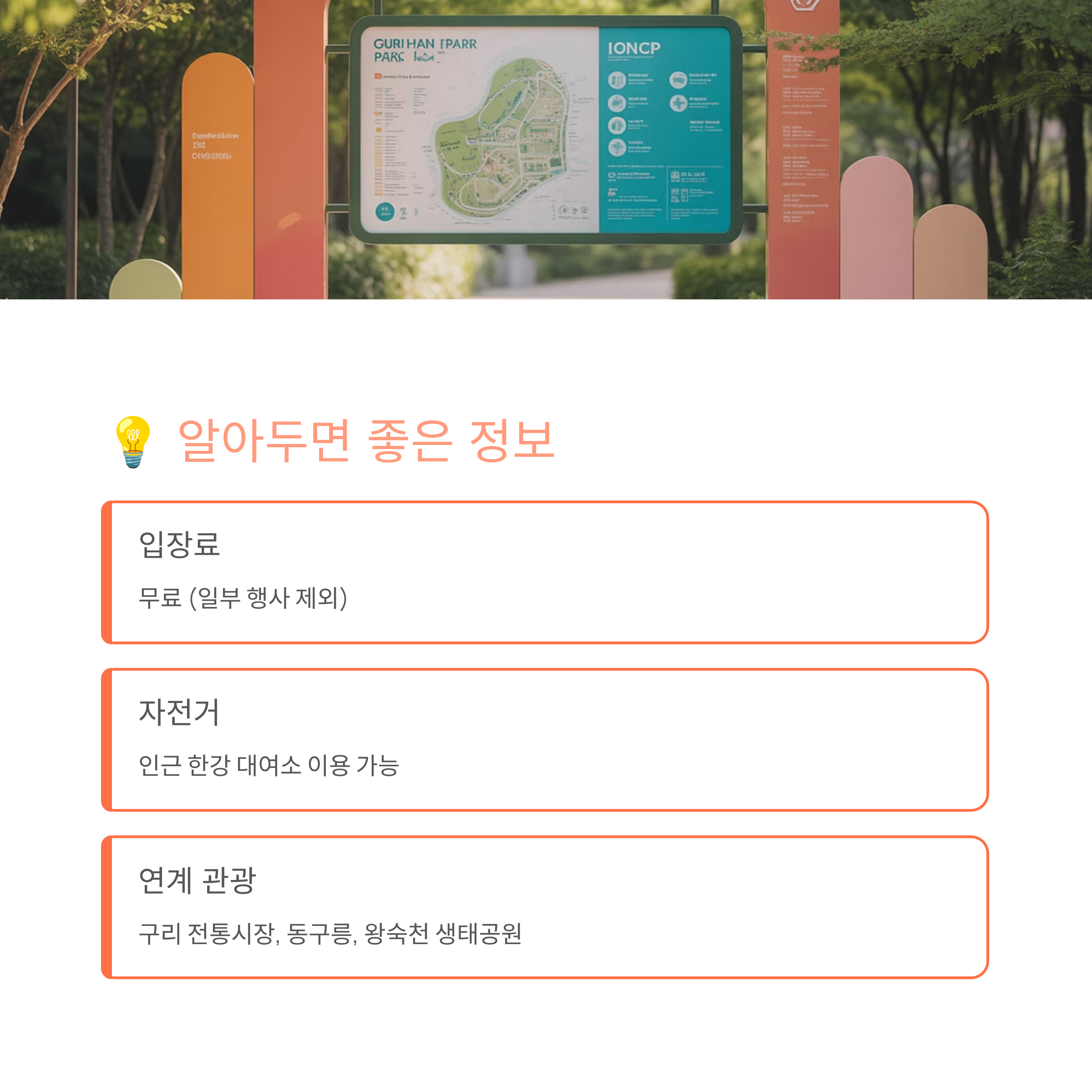 구리 한강시민공원에는 주차장, 화장실, 매점 등이 잘 마련되어 있습니다. 구리시청 홈페이지(구리시 공식 사이트)에서 행사 일정과 공원 이용 정보를 확인하면 더 알찬 방문이 가능합니다.