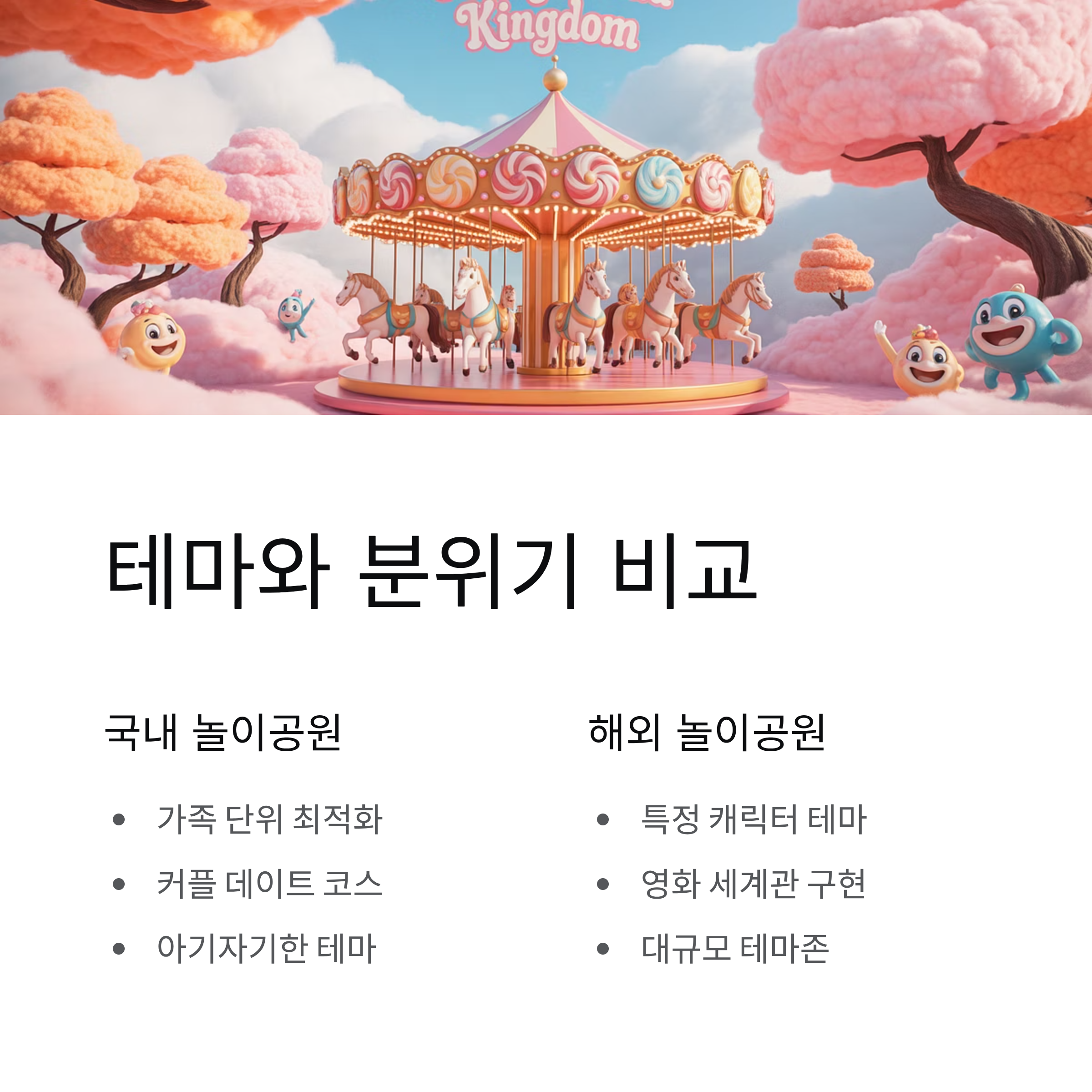오늘은 국내와 해외 놀이공원의 특징을 비교하며 각자의 매력을 살펴보겠습니다.