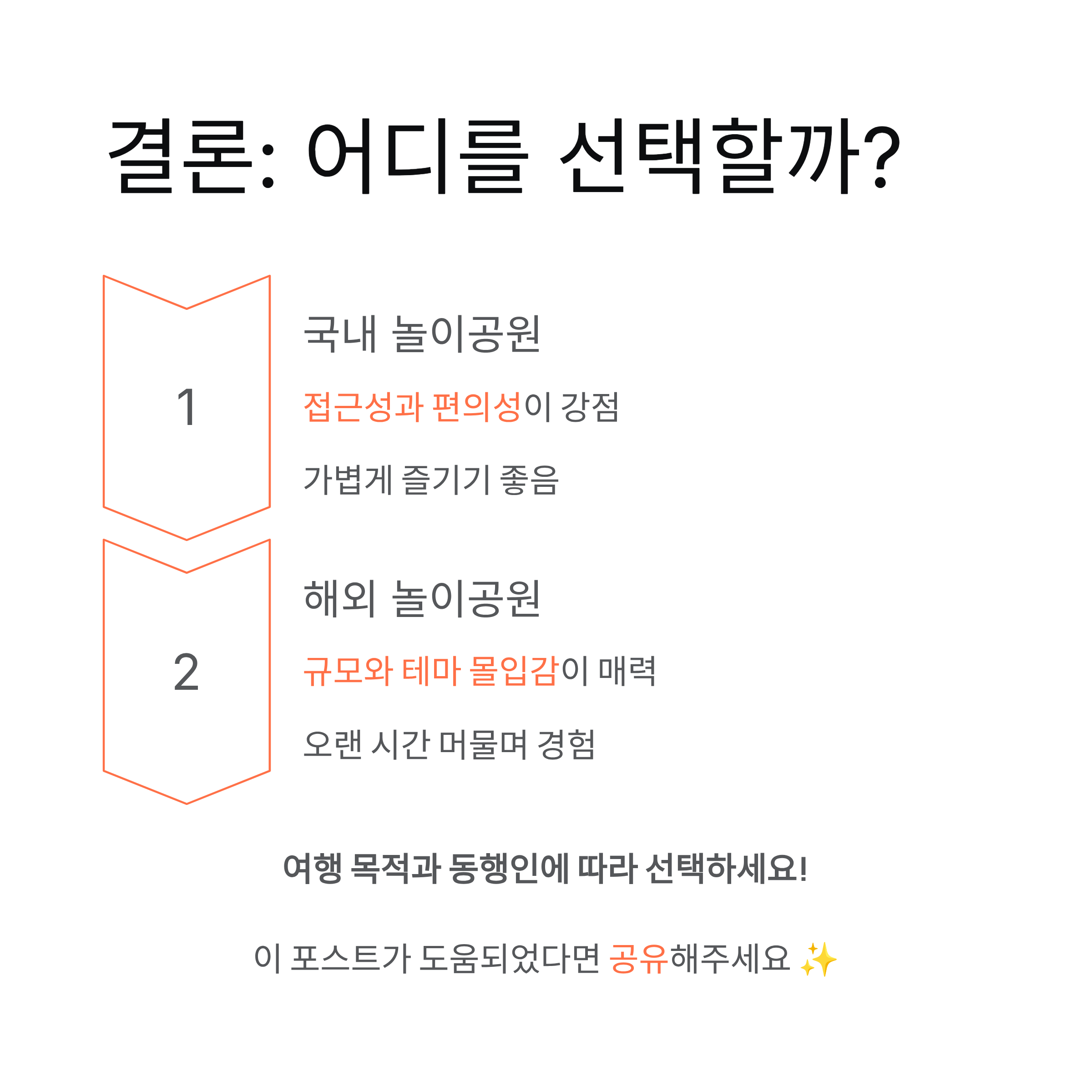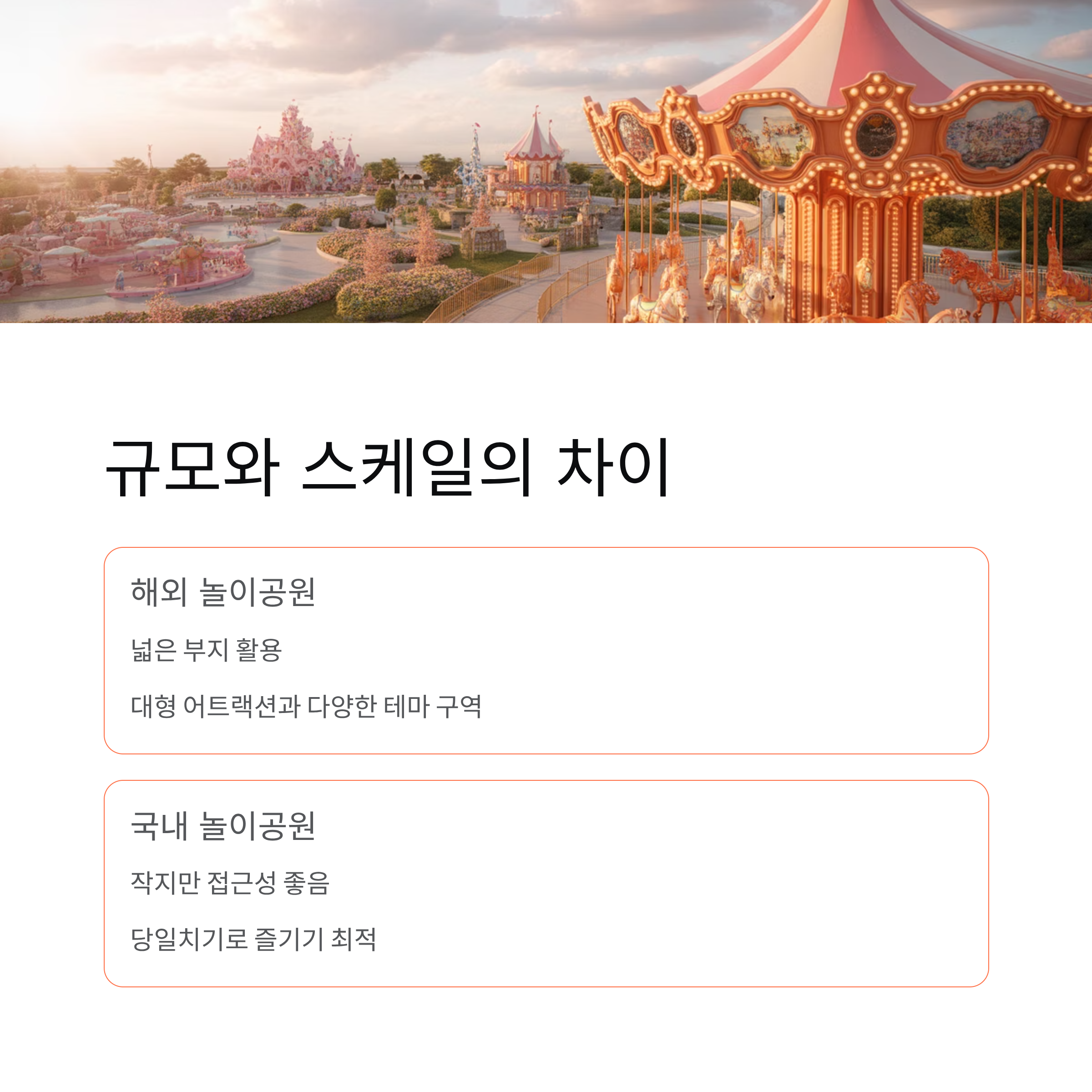 국내 놀이공원은 접근성과 편의성이 강점이고, 해외 놀이공원은 규모와 테마의 몰입감이 매력입니다.