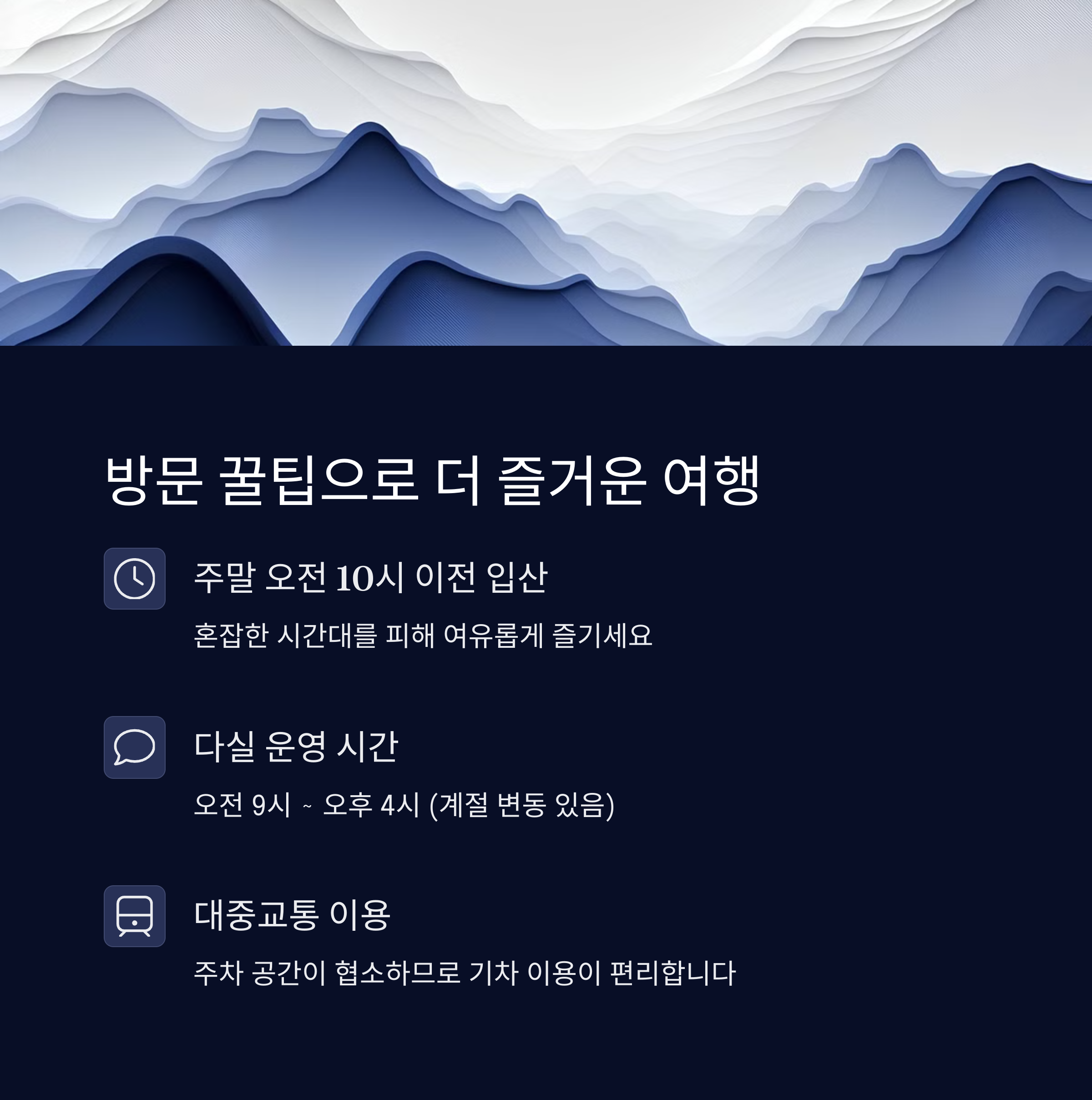 • 주말 오전 10시 이전 입산 권장 (혼잡 시간 회피)