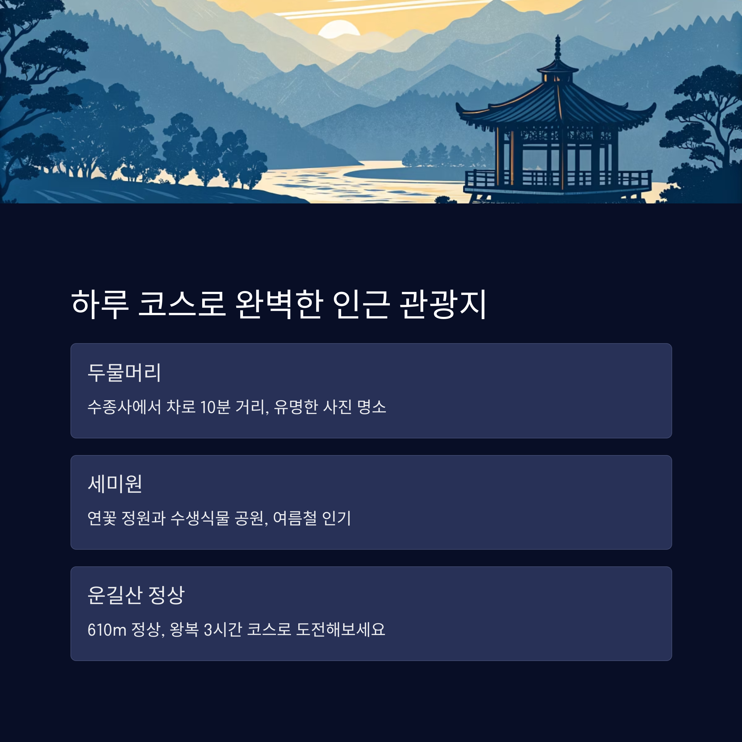 "트레킹 + 사찰 + 자연 정원 코스를 묶으면 하루가 아주 알차게 채워집니다."