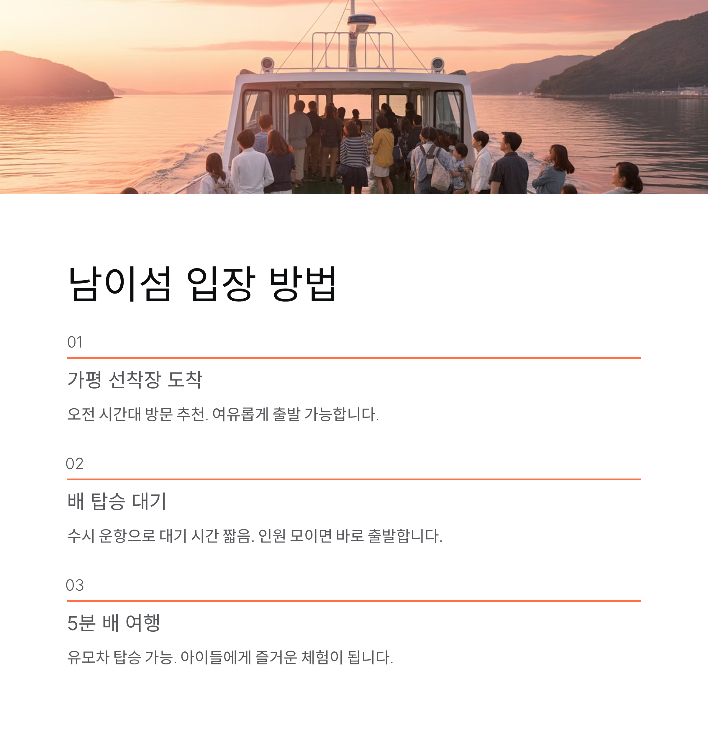 남이섬은 배를 타고 들어가야 하는 섬입니다. 가평 선착장에서 출발하며, 배는 정해진 시간표보다는 수시 운항에 가까운 방식으로 운영됩니다. 보통 대기 인원이 모이면 출발하는 구조라 성수기에도 오래 기다리지 않는 편입니다. 가족 여행이라면 오전 시간대에 도착해 비교적 여유 있게 이동하는 것이 좋습니다.
