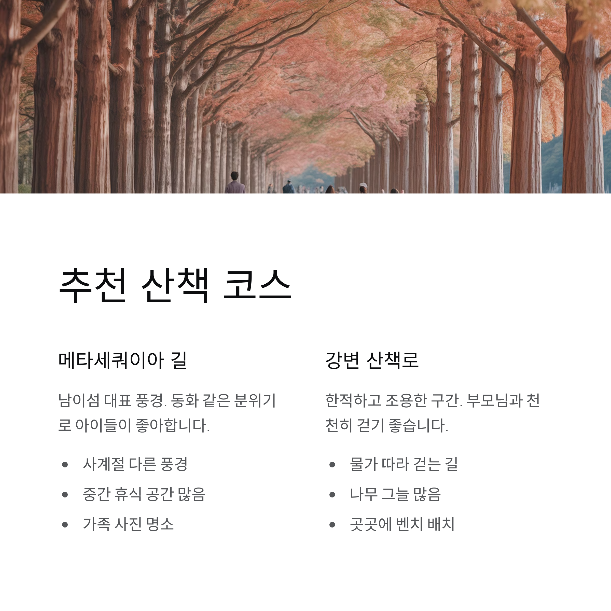 | 메타세쿼이아 길 | 남이섬 대표 풍경 | 전 가족 |