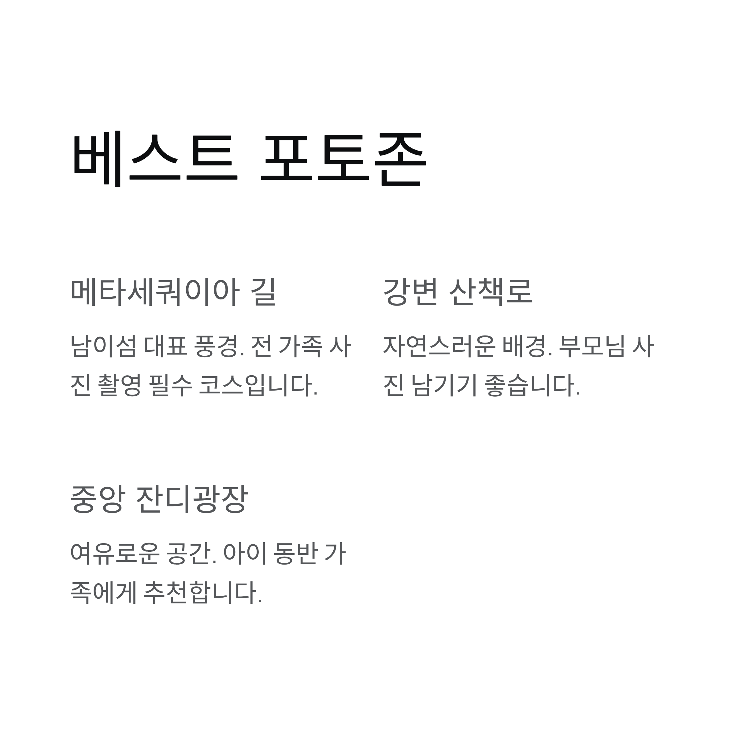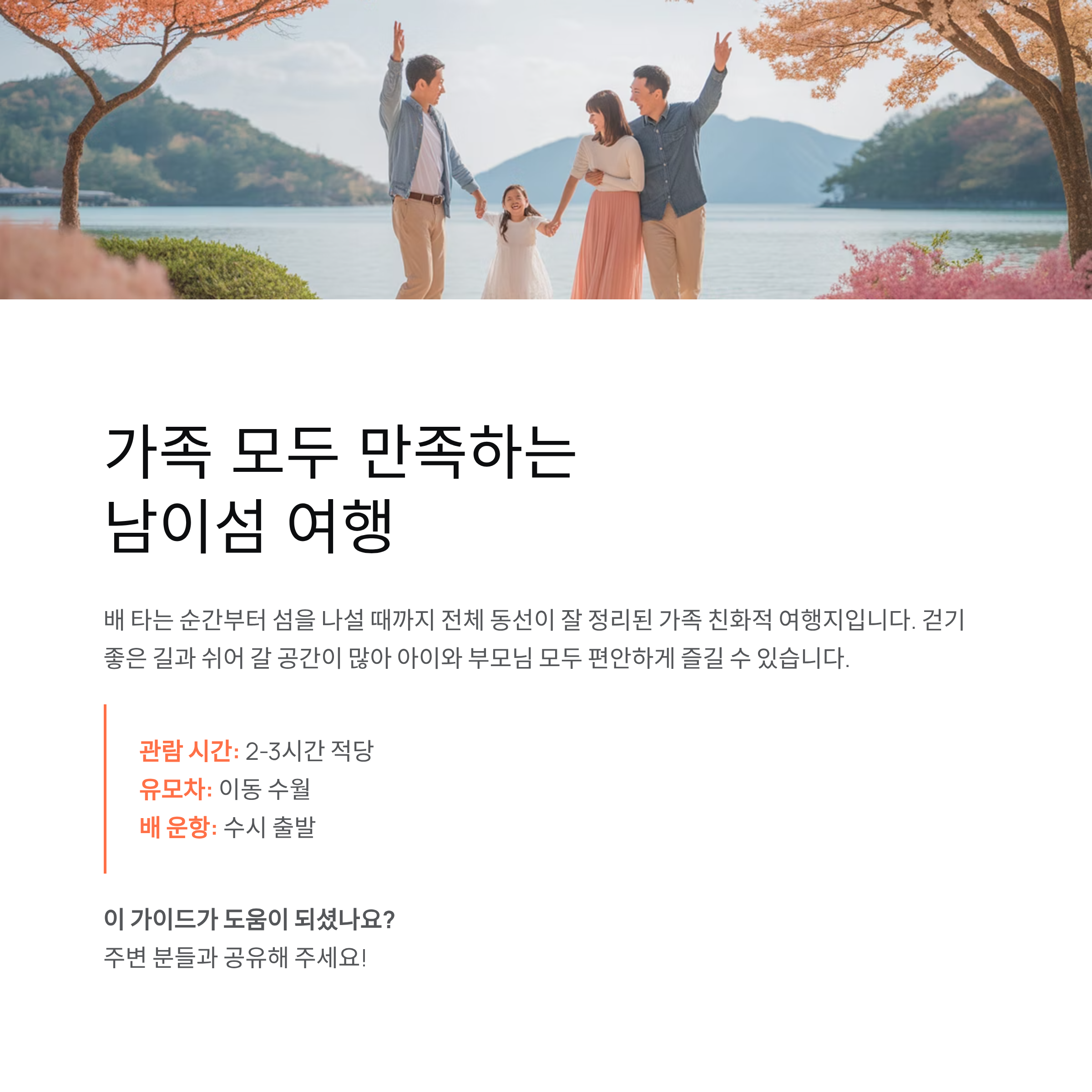 남이섬은 배를 타는 순간부터 섬을 나설 때까지 전체 동선이 잘 정리된 가족 친화적인 여행지입니다. 배 시간 걱정이 적고, 걷기 좋은 길과 쉬어 갈 공간이 많아 아이와 부모님 모두 편안하게 즐길 수 있습니다. 가족 모두가 만족할 여행지를 찾고 있다면 남이섬은 언제나 안정적인 선택이 될 수 있습니다.