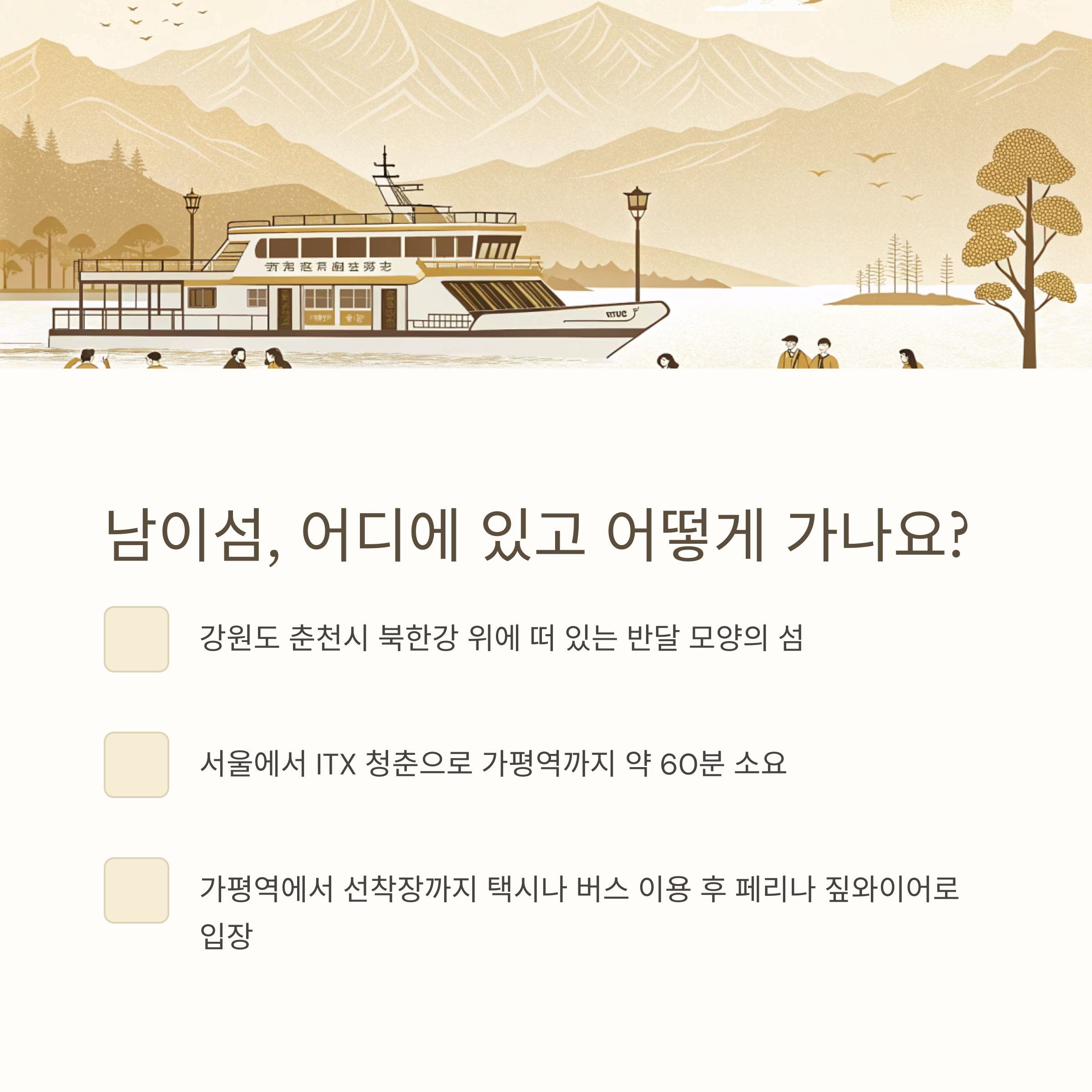 남이섬은 경기도와 강원도의 경계에 위치한 작은 섬이지만, 자연과 여유로움이 가득한 여행지로 사랑받고 있습니다. 특히 자전거를 타며 섬 전체를 둘러보는 여행은 남이섬의 핵심 매력 중 하나입니다. 더불어 울창한 나무길을 따라 걷는 산책은 계절마다 다른 풍경을 선물해 주며 힐링을 선사하지요. 이번 글에서는 남이섬에서 자전거 타기와 나무길 산책을 중심으로 여행의 모든 포인트를 담았습니다.