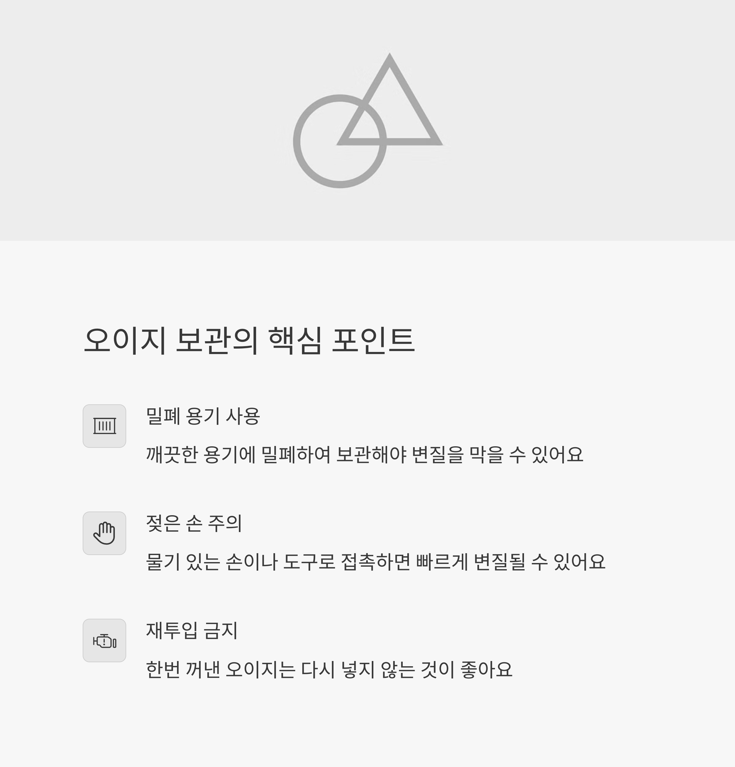 | 보관 온도와 위생 상태에 따라 차이가 있어요. | 불쾌한 냄새나 맛 변화가 있으면 섭취하지 마세요. | 젓가락보다 전용 집게를 사용하는 것도 방법이에요. |