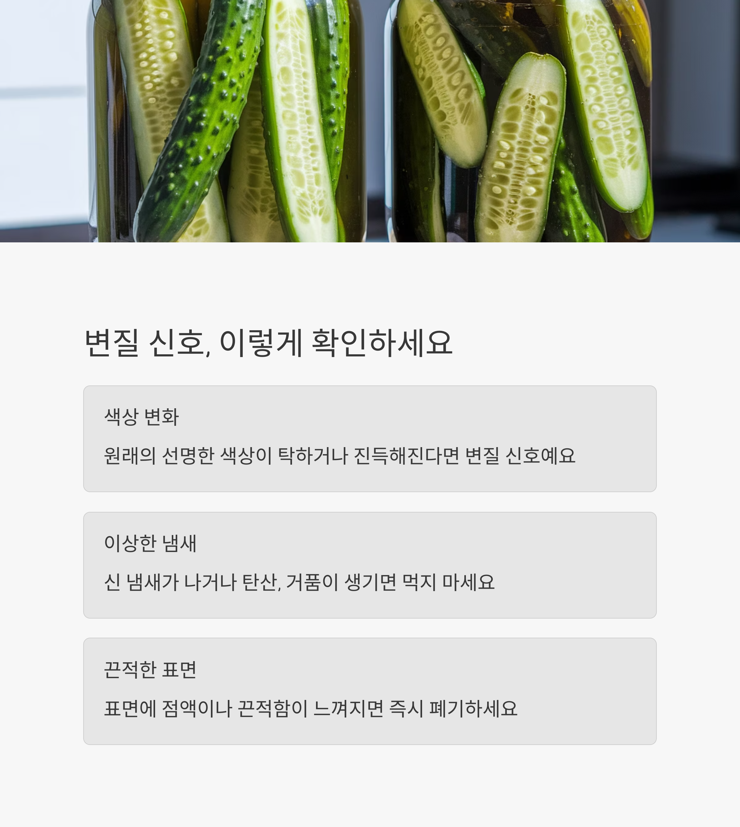 냉장고 속 오이지가 여전히 괜찮은지 직접 확인하려면 색, 냄새, 질감, 맛을 점검해보는 것이 중요해요. 색이 갈변되어 탁하거나, 군내, 쉰 냄새, 혹은 표면에 끈적임이 느껴진다면 이미 변질된 상태일 수 있어 섭취를 피해야 합니다. 조금 오래된 오이지라도 색이 맑고 짠맛과 특유의 향이 유지된다면 무침 등으로 얼마든지 활용 가능합니다.