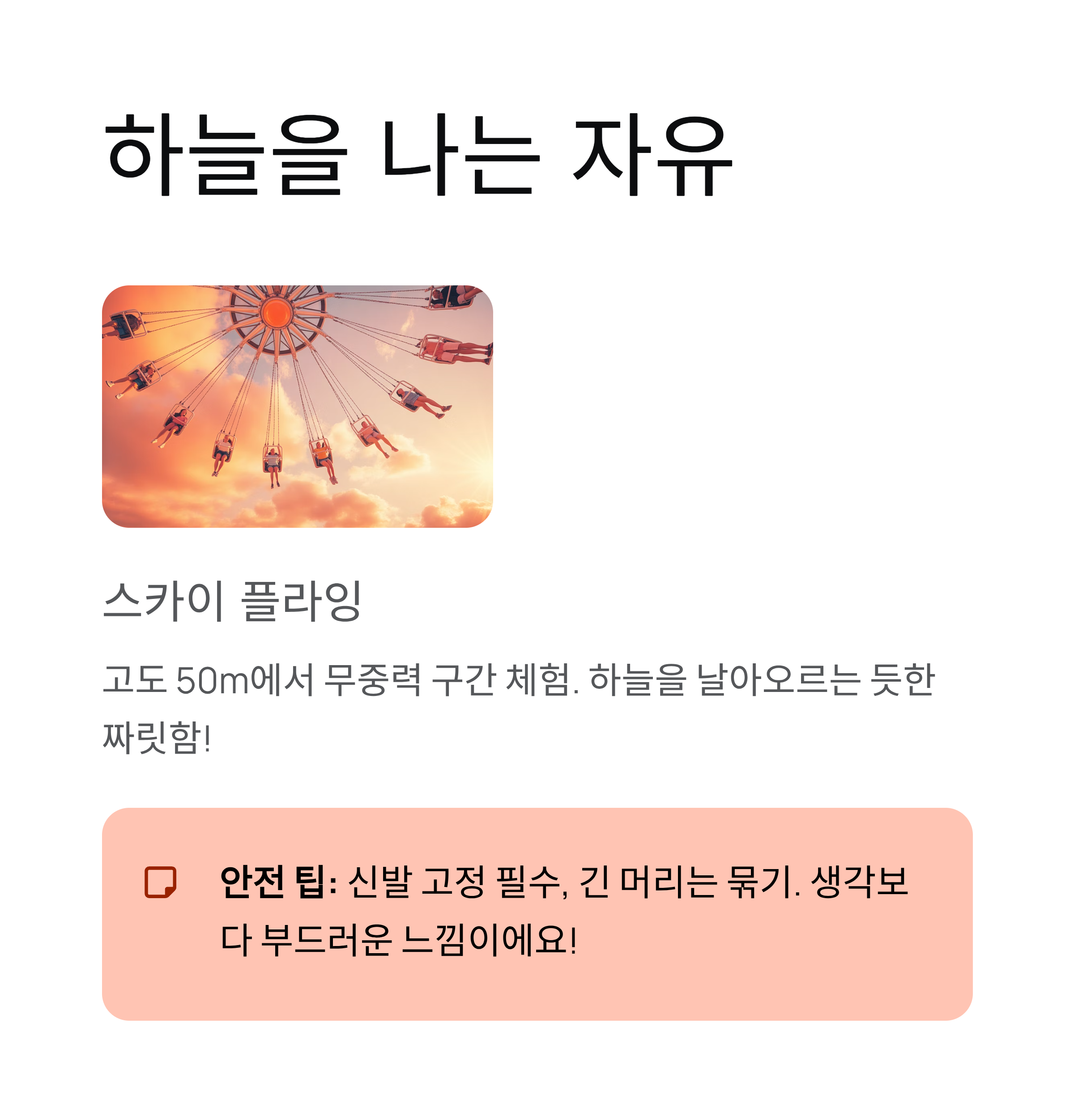 놀이공원에서 한 번쯤 타보는 **스카이 플라잉(Sky Flying)**은 중력에서 해방된 듯한 자유를 느낄 수 있는 어트랙션입니다.