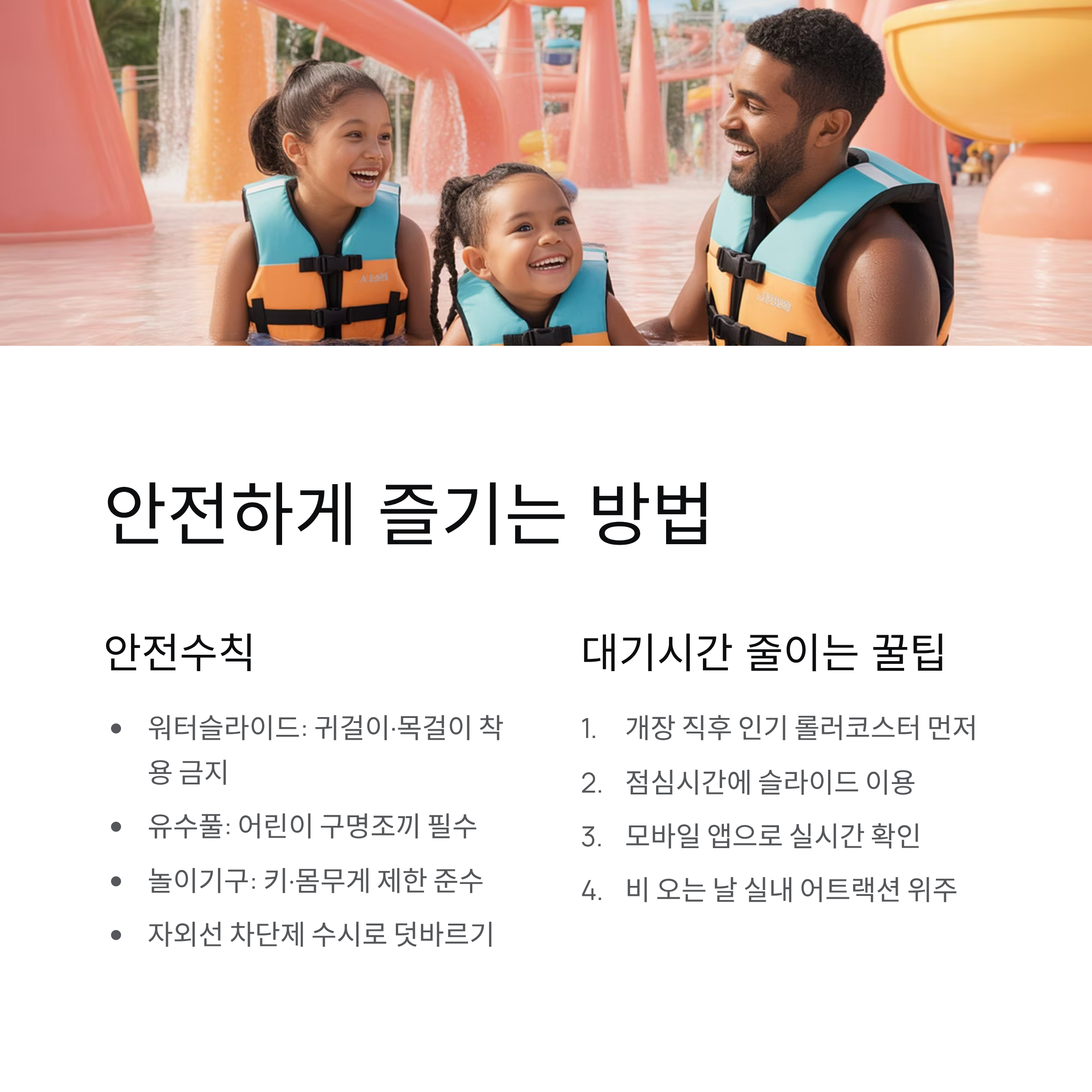 | 워터슬라이드 | 탑승 전 반드시 신체 상태 확인, 귀걸이·목걸이 착용 금지 |