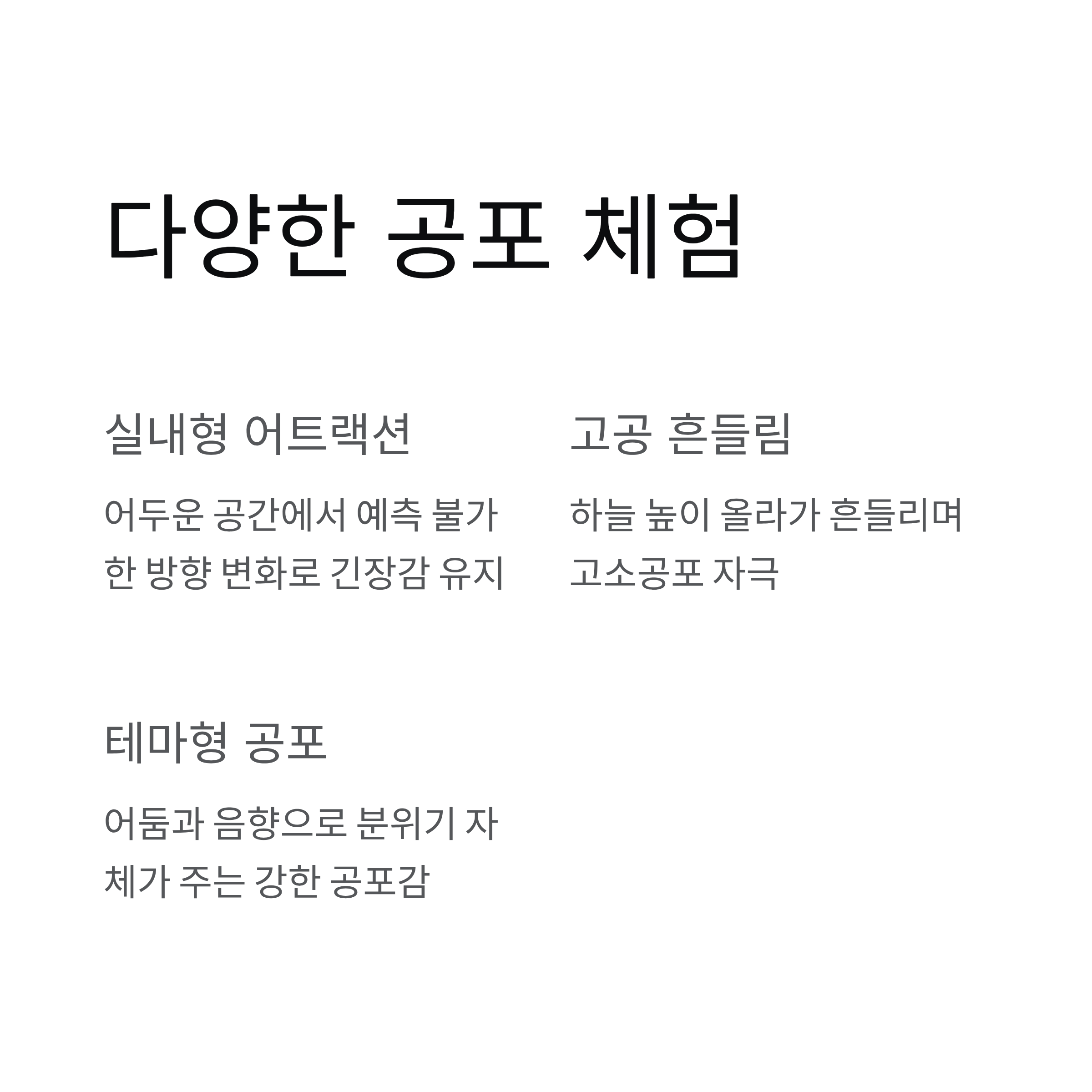 빛이 거의 없는 공간을 빠르게 통과하는 실내형은 방향 변화를 예상하기 어렵다는 점에서 공포감을 줘요. 갑작스러운 속도 변화나 급회전이 이어지면서 전체적으로 긴장감이 유지됩니다. 외부에서 보기엔 평범해 보여도 직접 타면 강한 스릴을 주는 경우가 많아요.