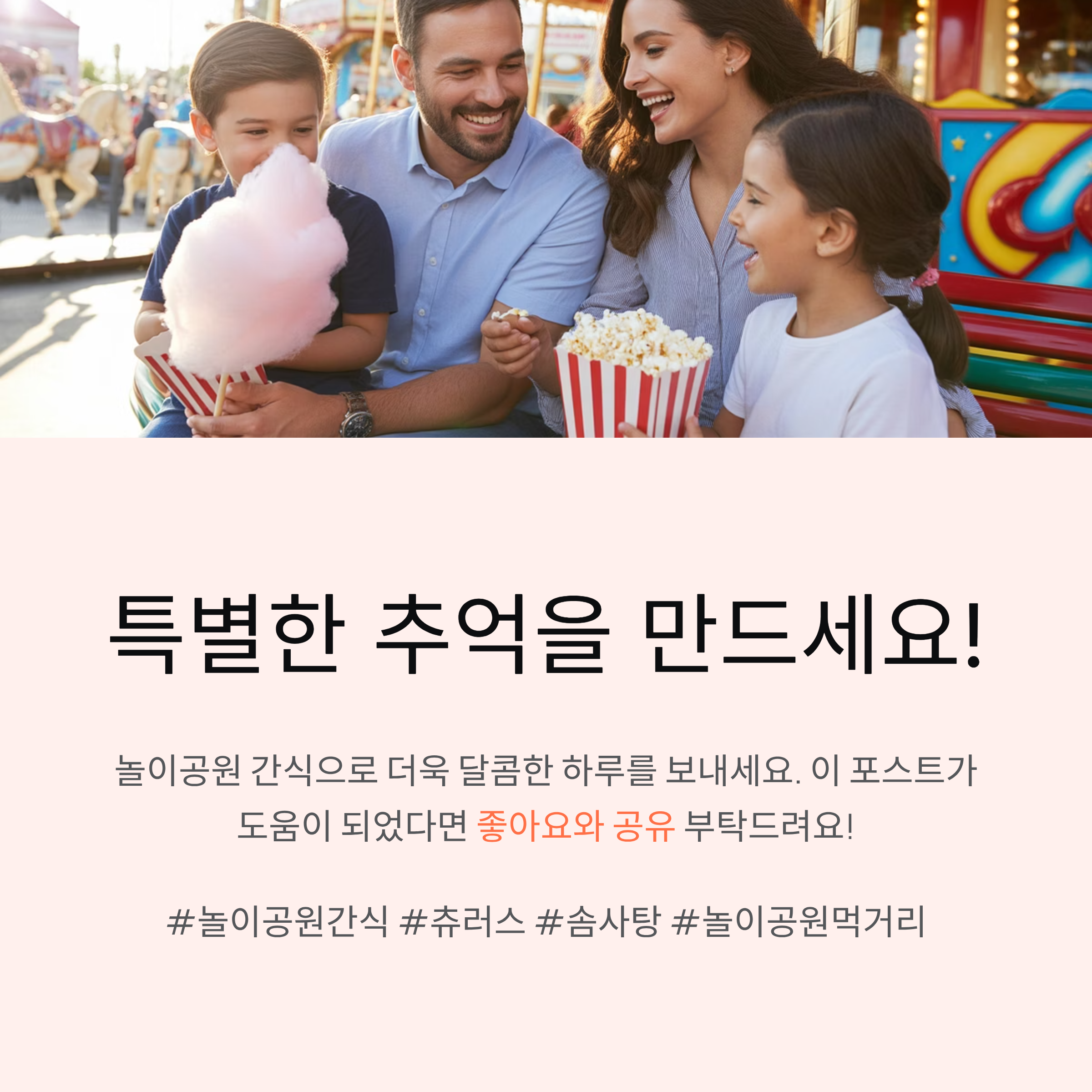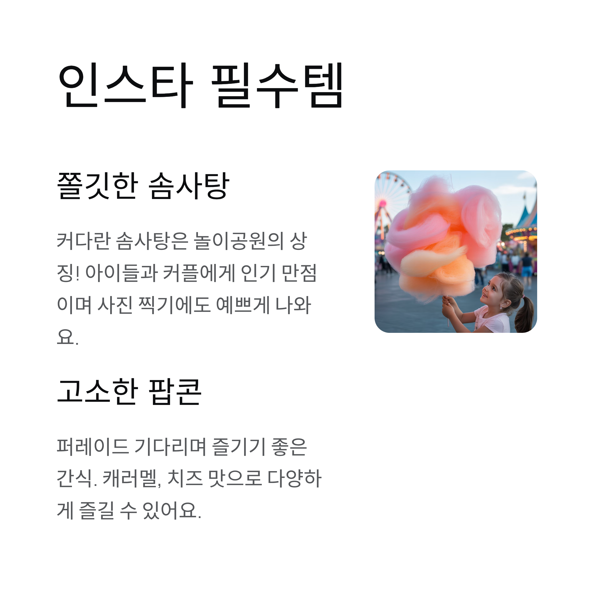 오늘은 놀이공원에서 꼭 맛봐야 할 인기 간식 메뉴를 소개합니다.