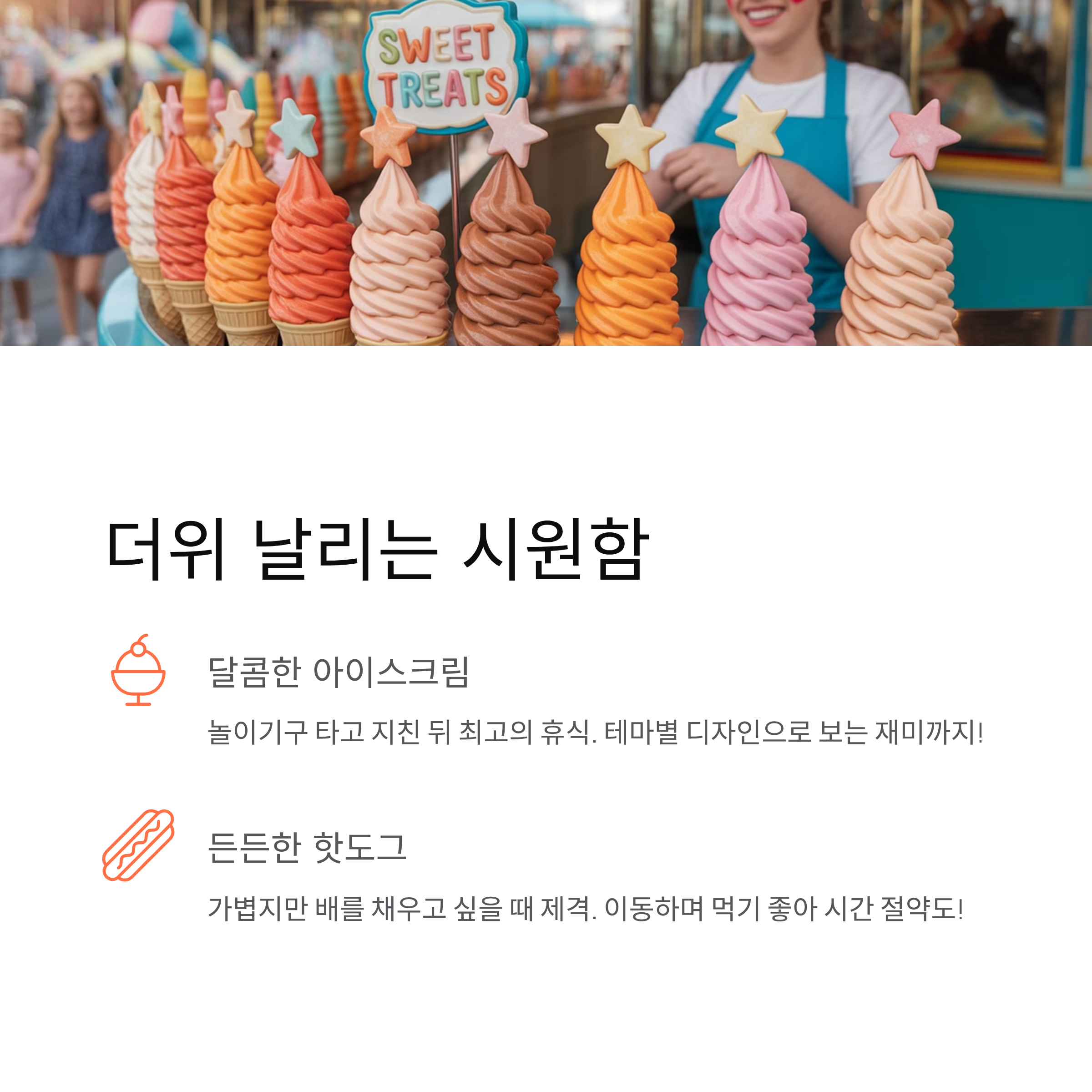 놀이기구 타고 지친 뒤에는 달콤한 아이스크림이 최고의 휴식입니다.