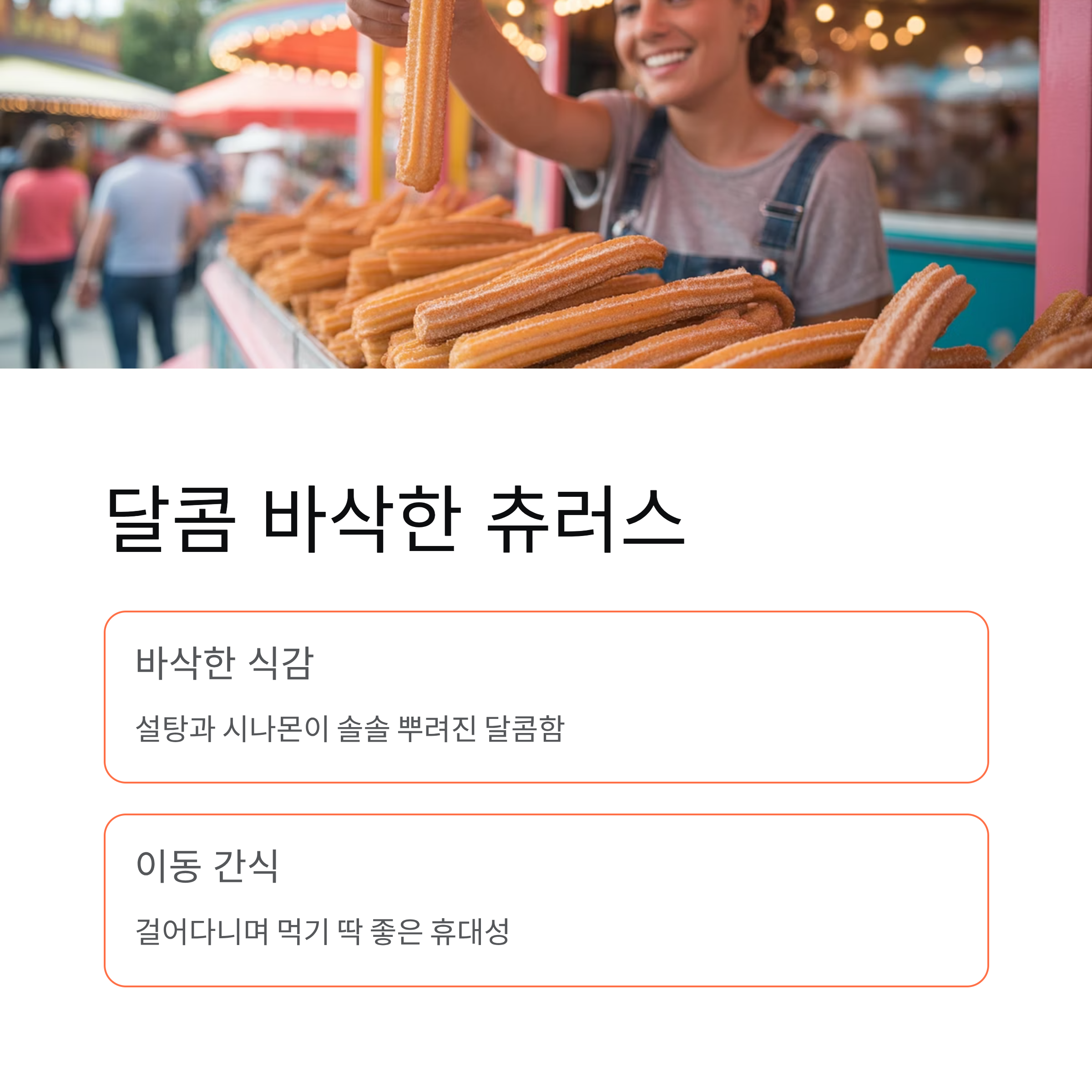 | 츄러스 | 바삭하고 달콤 | 걷거나 줄 설 때 |