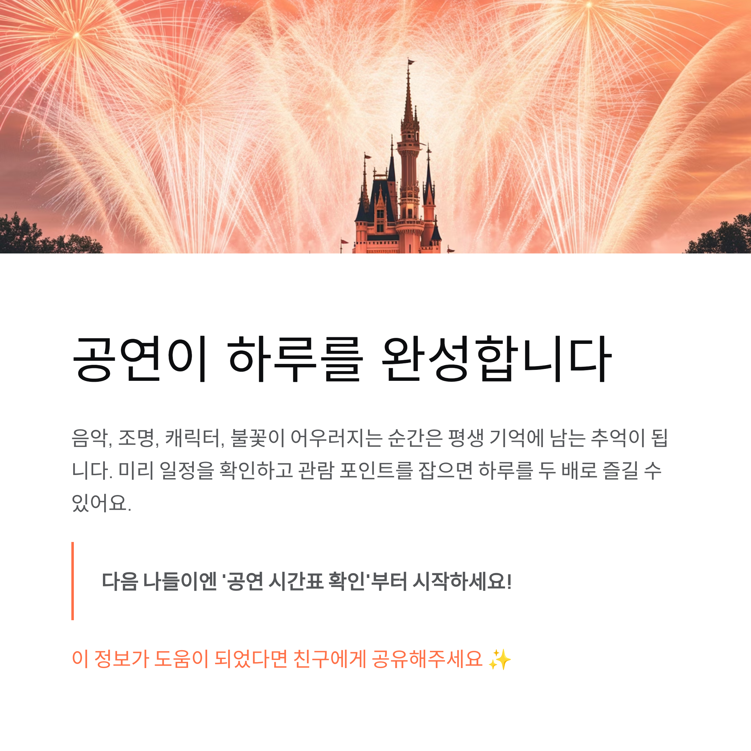 하루를 200% 즐기는 꿀팁, 공연·퍼레이드 시간 놓치지 마세요