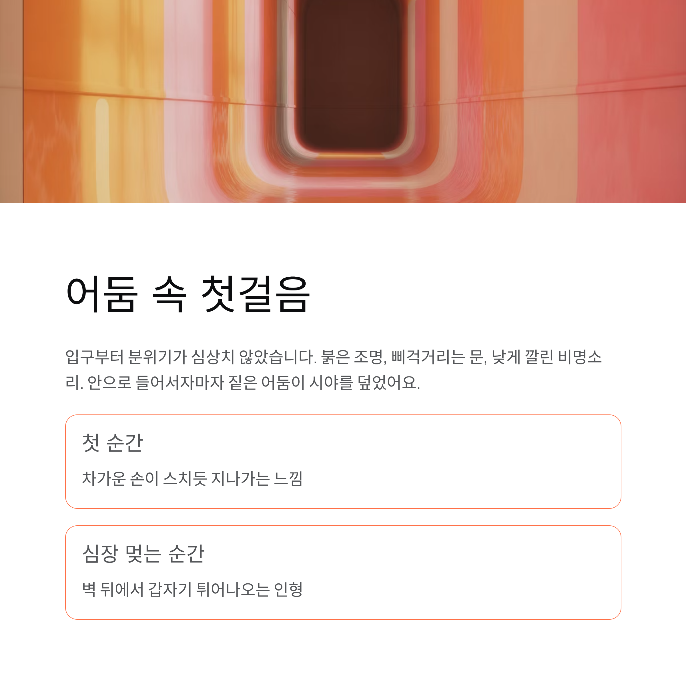 입구부터 분위기가 심상치 않았습니다. 붉은 조명, 삐걱거리는 문, 낮게 깔린 비명소리.