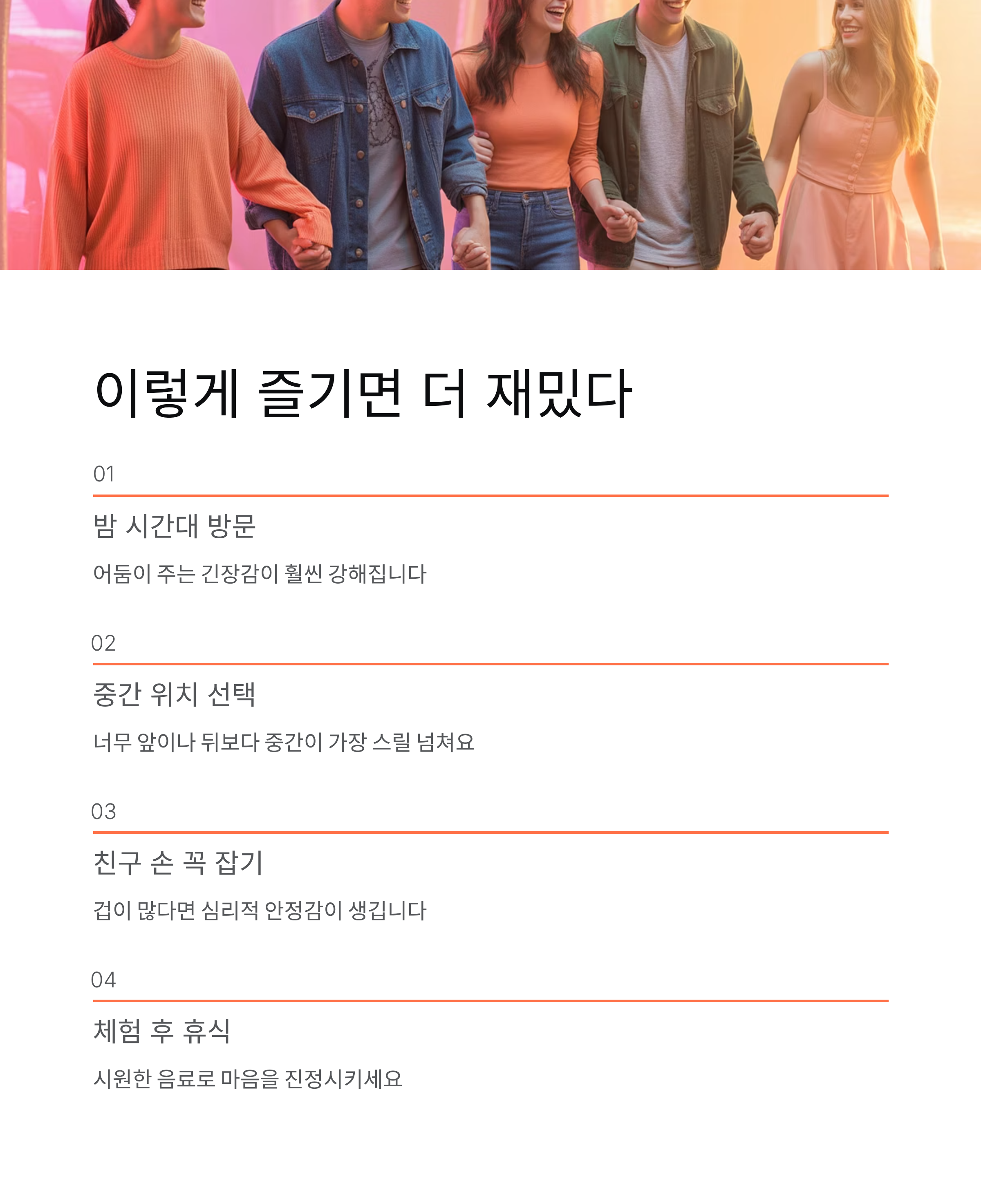 - 겁이 많다면 친구 손을 꼭 잡고 가세요. 심리적 안정감이 생깁니다.