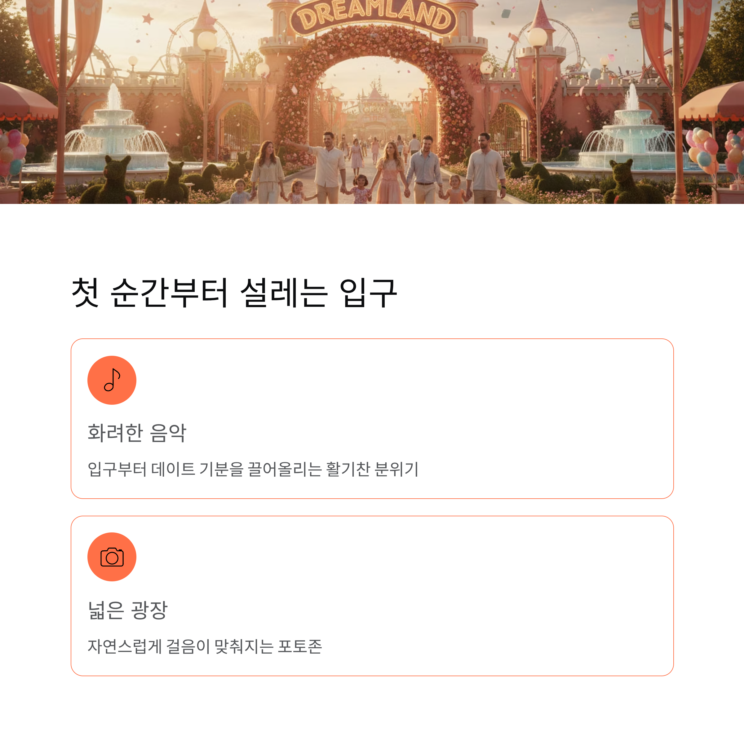 놀이공원 내부 테마거리는 데이트 핵심이었습니다. 천천히 걸으면서 둘러보는 재미가 있고, 음악과 조명이 분위기를 자연스럽게 끌어올려줘요. 움직임이 많은 놀이기구를 잠시 벗어나 여유를 즐기기 좋았습니다. 걷다가 우연히 보이는 포토존도 다양해 중간중간 사진 찍기에도 좋아요.
