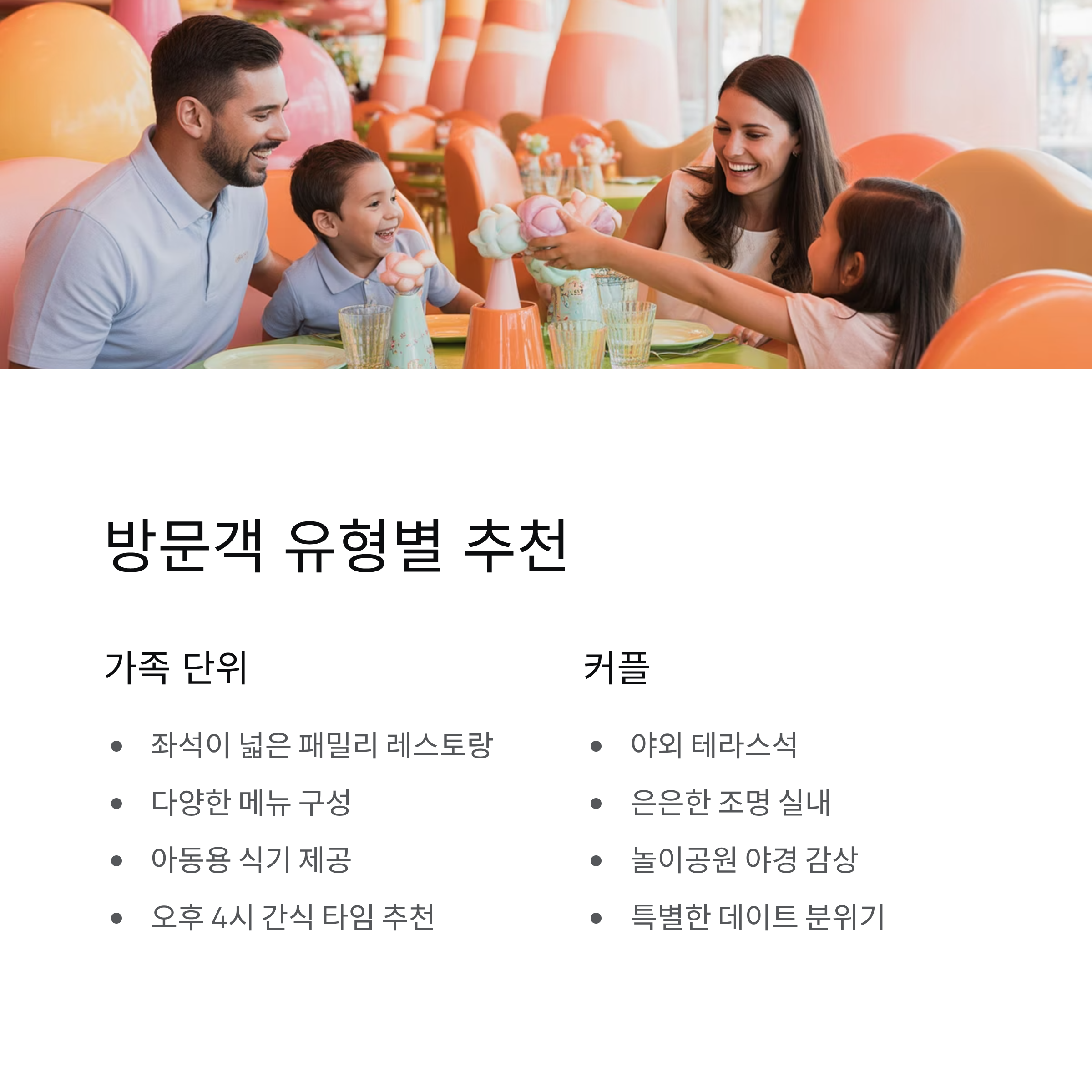 단순히 ‘배를 채우는 곳’이 아니라, 놀이의 즐거움을 이어주는 ‘휴식의 공간’으로서의 레스토랑 선택법까지 꼼꼼히 정리했습니다.