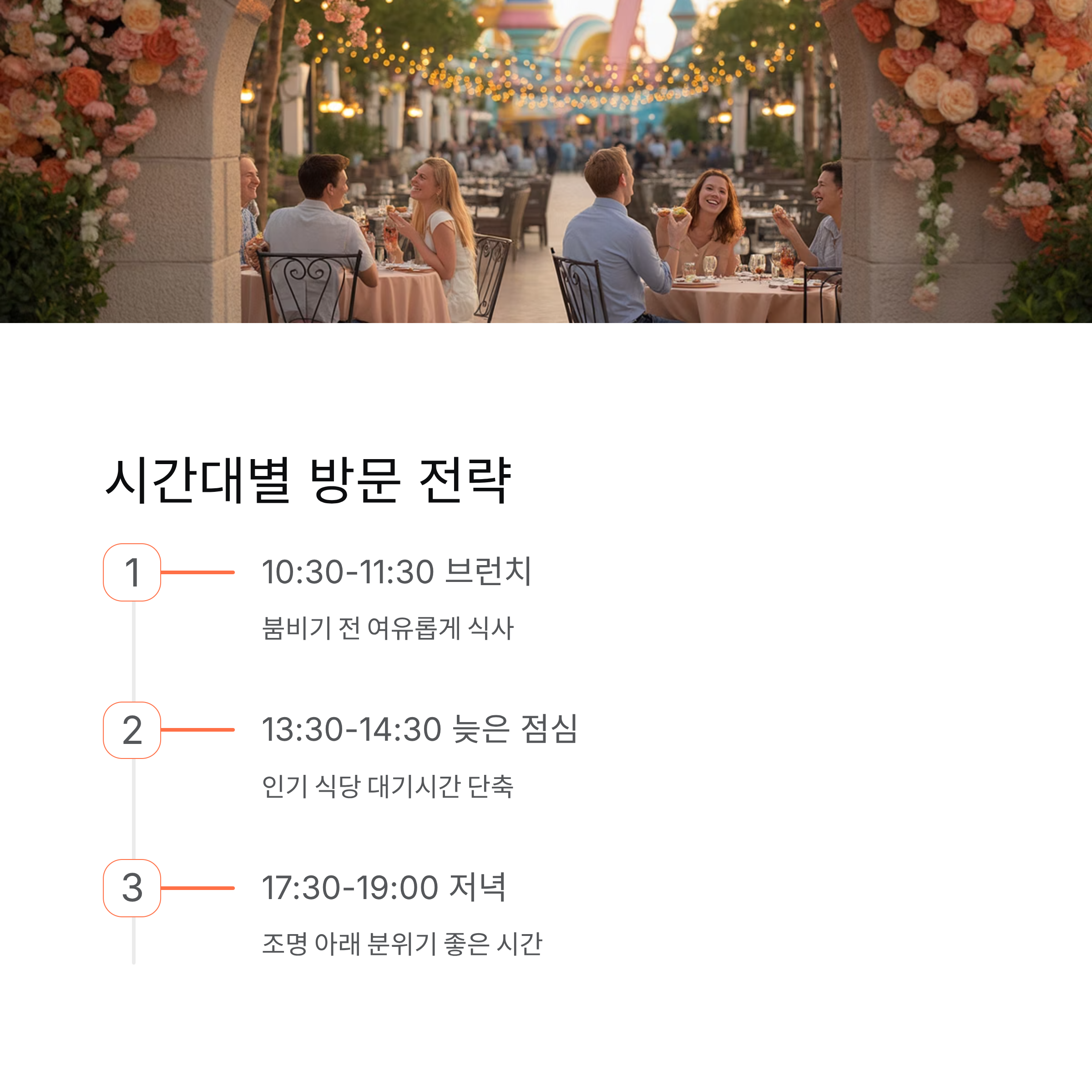 테마별 분위기, 메뉴의 개성, 시간대별 전략을 잘 세운다면 놀이공원 속에서도 최고의 맛집 경험을 만들 수 있습니다.