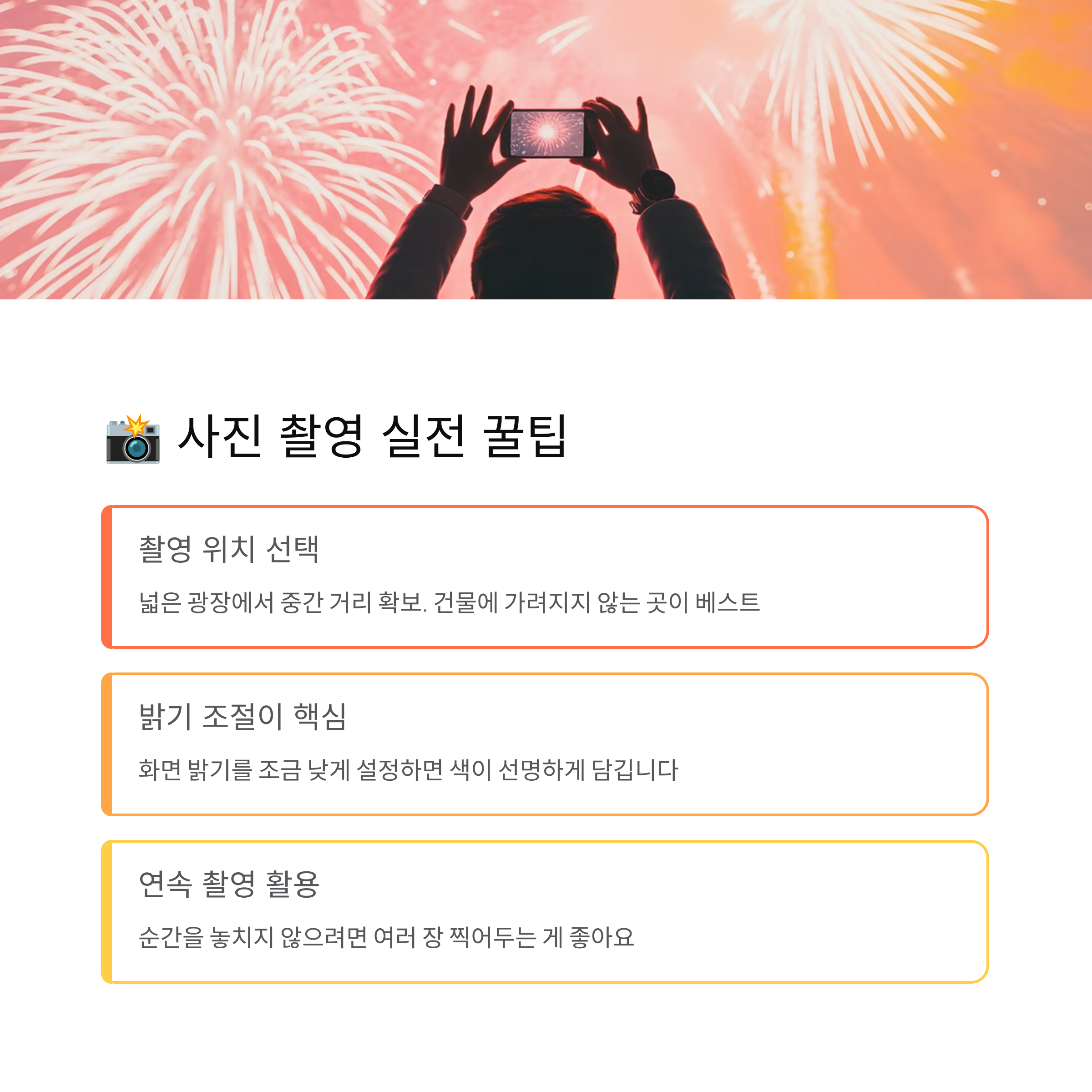 불꽃은 순간적으로 터지기 때문에 연속 촬영이 꽤 유용합니다. 화면 밝기를 너무 높게 잡으면 색이 날아가기 때문에 적절한 밝기를 유지하는 것이 중요합니다. 특히 스마트폰으로 촬영할 때는 화면을 어둡게 조정하면 색이 더 선명하게 담기고, 흔들림이 적은 구도를 잡을 수 있어요.