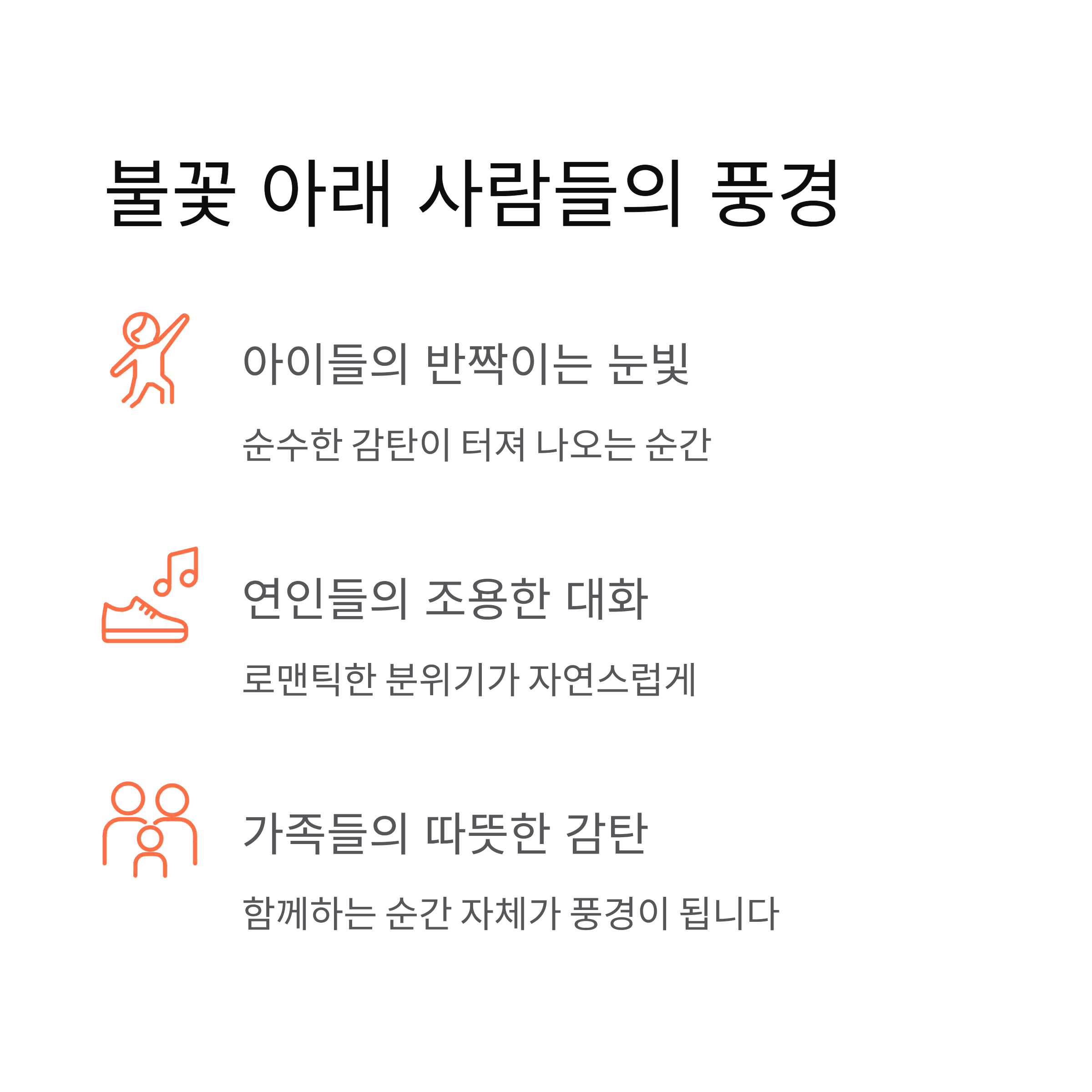 불꽃놀이는 시각적인 즐거움도 있지만 주변 사람들의 분위기와 함께 어우러지는 경우가 많습니다. 아이들의 반짝이는 눈빛, 연인들의 조용한 대화, 가족들의 감탄이 자연스럽게 섞이며 그 순간 자체가 하나의 풍경이 됩니다. 이런 분위기 덕분에 매년 다시 가고 싶어지는 이유가 생기죠.